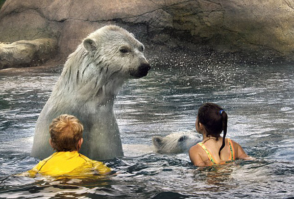 Κι όμως, οι φωτογραφίες που βλέπετε είναι πραγματικές και τα πλάνα αυτά είναι συνηθισμένα καθημερινά, αφού παιδιά και πολικές αρκούδες κολυμπούν μαζί στο πάρκο «Polar Bear Habitat» τον Καναδά, σε μια προσπάθεια των ιδιοκτητών να ευαισθητοποιήσουν τον κόσμο σχετικά με τη συμπεριφορά των εκπληκτικών αυτών ζώων.