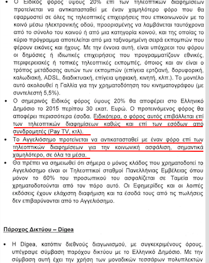 Ιδιαίτερα δύσκολη είναι η κατάσταση στη συνδρομητική τηλεόραση. Η απόφαση της κυβέρνησης, μετά από πίεση της ΕΙΤΗΣΕΕ προς την «τρόικα», για διπλή φορολόγηση του κλάδου πιέζει σε σημαντικό βαθμό και την Cosmote TV και τη Nova. Οι δύο φορείς συνδρομητικής τηλεόρασης αποδίδουν φόρο 10% επί των συνδρομών και ένα επιπλέον 2% επί του κύκλου εργασιών υπέρ του ΕΔΟΕΑΠ. Το πλέον ανησυχητικό είναι η στασιμότητα των νέων συνδέσεων αλλά και η επιστροφή της διακοπής των συμβάσεων των συνδρομητών με τις πλατφόρμες. Τα νοικοκυριά, υπό το βάρος της συνολικής φορολόγησης και των ειδικών φόρων σε Cosmote και Nova (10% συνδρομητική TV, 5% internet), αντιμετωπίζουν και πάλι τις συγκεκριμένες υπηρεσίες ως πολυτέλεια. Η αλήθεια είναι ότι οι δύο νέοι φόροι που επιβλήθηκαν το 2016 έχουν σχεδόν σταματήσει την ανάπτυξη του κλάδου, ενώ η εισφορά του 2% αναπροσαρμόζει τον σχεδιασμό τους υπό δυσμενέστερους όρους. Από το ΠΑΡΟΝ