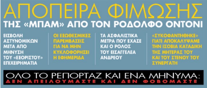 «Αυτήν τη στιγμή έχουν συλληφθεί δυο συνεργάτες μου ενώ ψάχνουν και εμένα. Το λάθος μας ήταν να δημοσιοποιήσουμε δικαστική απόφαση που αφορούσε τα ισόβια που επιβλήθηκαν στην Φρ. Οντονι και τον Κ. Κυριακοπουλο για εγκληματική οργάνωση, απιστία, κλπ αλλά και η έρευνα για την υπόθεση της Sportime, την Sportingbet κτλ! Στο μεσοδιάστημα από το περασμένο Σάββατο ξεκίνησαν οι πιέσεις για να μην εκδοθεί η ΜΠΑΜ. Την Τετάρτη απορρίφθηκε η αίτηση προσωρινής διαταγής και δικαιωθήκαμε στο Δικαστήριο και ω του θαύματος σήμερα ενεργοποιήθηκε το αυτόφωρο (επειδή το πρωτοσέλιδο της εφημερίδας είναι αναρτημένο στο www.empam.gr) γιατί κάποιοι θέλουν ΝΑ ΜΗΝ ΚΥΚΛΟΦΟΡΗΣΟΥΜΕ! Διαρκές έγκλημα η αποκάλυψη της αλήθειας στην Ελλάδα του 2018. Και μετά μιλάμε για ελευθεροτυπία!». Απο τους zoornalistas