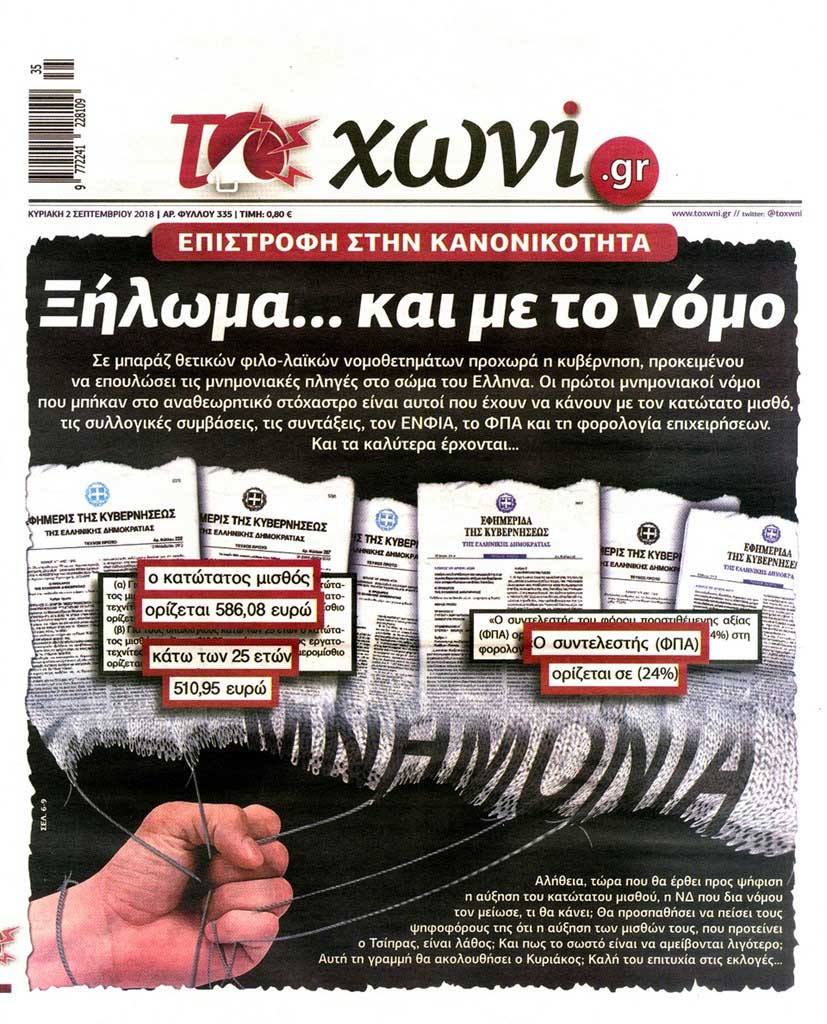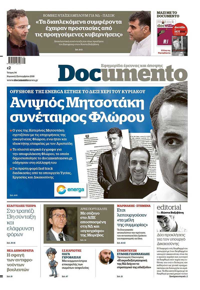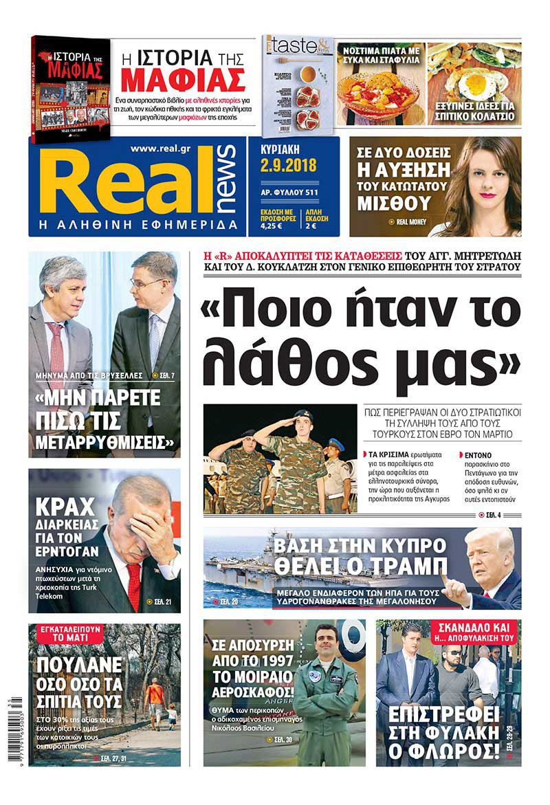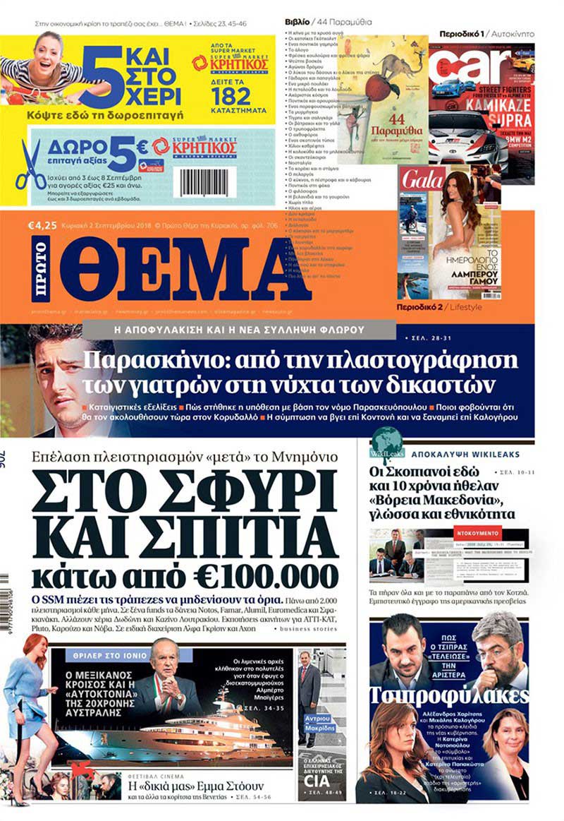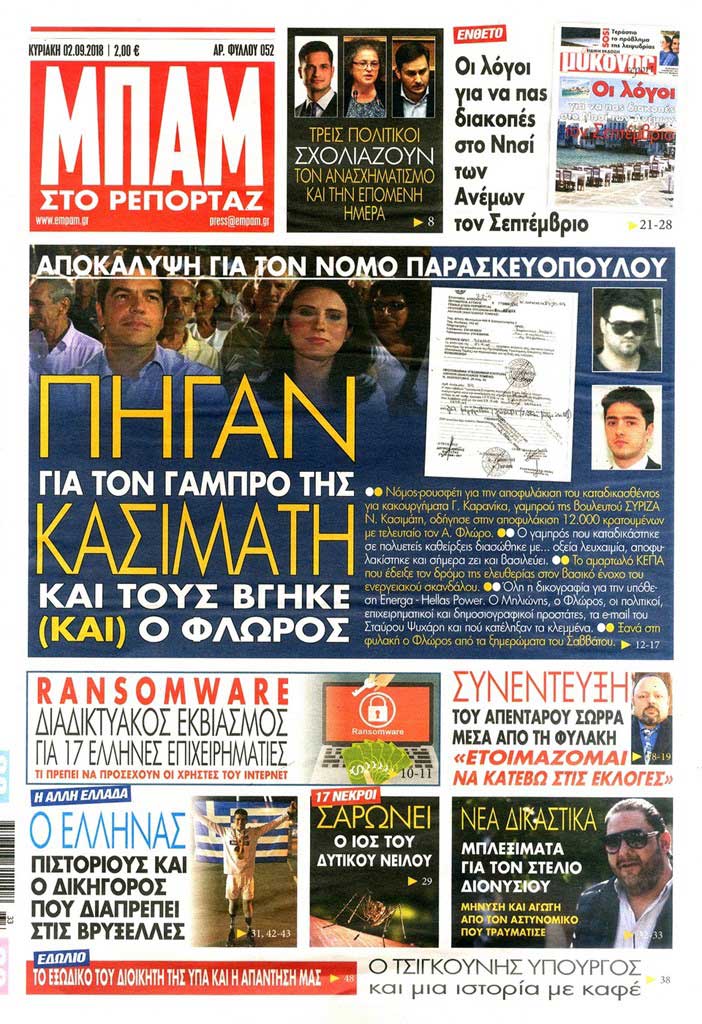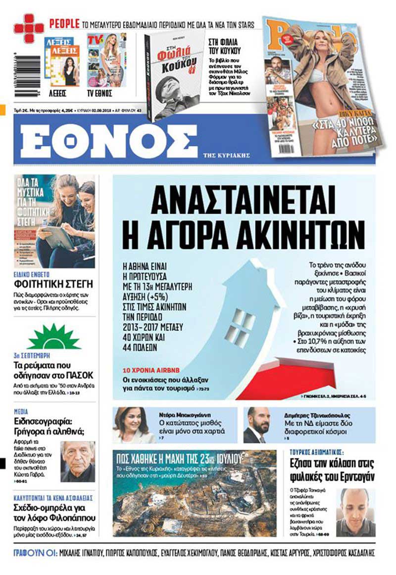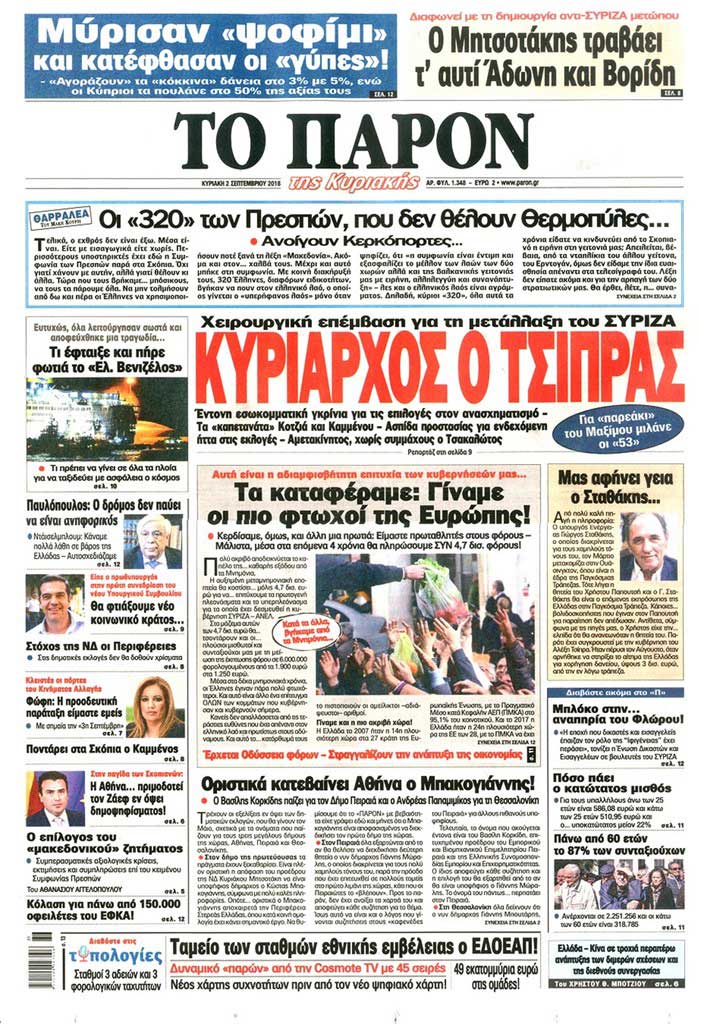 Τα πρωτοσέλιδα των Κυριακάτικων εφημερίδων 2ας Σεπτεμβρίου 2018 Ημερομηνία: