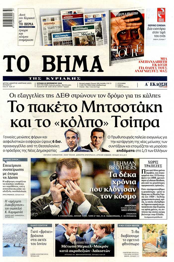 Τα πρωτοσέλιδα των Κυριακάτικων εφημερίδων 16ης Σεπτεμβρίου 2018 Ημερομηνία: