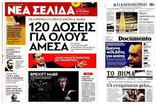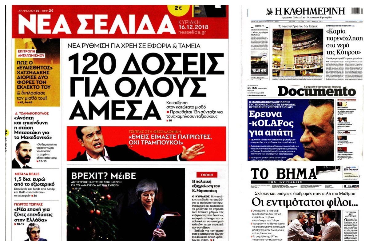 Δείτε τα κυριότερα πρωτοσέλιδα του κυριακάτικου Τύπου, για σήμερα, 16 Δεκεμβρίου 2018.