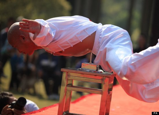 Ο 47χρονος, βάρους 66 κιλών κασκαντέρ κουνά ακόμα και τα χέρια του καθώς κάνει το κόλπο, πριν σκύψει κάτω μπροστά από το πλήθος για να δείξει