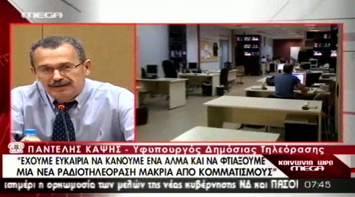 @ΤΟ έχει μάλλον η ιδιοσυγκρασία του. Από το ένα κανάλι στο άλλο...Ο Γιώργος Τράγκας στο Kontra Channel. Από την επόμενη βδομάδα ο Γιώργος Τράγκας θα έχει καθημερινή παρουσία στο Kontra, κάθε βράδυ από τις 9.00 ως τις 10.00. Ο δημοσιογράφος μέχρι πρότινος εργαζόταν στο E-Channel. Κάποτε ερχόταν στον Planet και με γκόμενες το έπαιζε με πούρα μεγάλος ιδιοκτήτης εφημερίδας. Φυσικά πήρε χοντρό χρήμα από την Ν.Δ. και τώρα το παίζει Αντιμνημονιακός...ε, ρε τι κορόιδια που είμαστε... @Χαμηλές κυκλοφορίες για τις κυριακάτικες εφημερίδες που βγήκαν το Σάββατο. Σύμφωνα με εκτιμήσεις των πρακτορείων τύπου στην πρώτη θέση βρέθηκε το Πρώτο Θέμα με 110.000 φύλλα, ακολουθεί το Έθνος με 90.000 φύλλα και έπονται, το Βήμα με 75.000 πωλήσεις, η Real με 67.000, η Δημοκρατια με 23.000, το ίδιο και ο Τύπος της Κυριακής( 23.000) καθώς και η Ελευθεροτυπία με 13.000 φύλλα. @Σε αυτούς τους δέκα μήνες ο Παντελής Καψής έδωσε περισσότερες από 50 συνεντεύξεις και καμία συνέντευξη Τύπου. Στις 15 Ιουλίου δηλώνει (στον Alpha) πως την επόμενη εβδομάδα θα γίνει προκήρυξη για 2.000 θέσεις στον ενδιάμεσο φορέα, δηλαδή τη Δ.Τ. για να προσληφθούν οι 500. Εγγυάται για το νόμο που θα έβγαινε για τη λειτουργία του νέου φορέα πως θα είναι «ανεξάρτητος» με προσωπικότητες μη κομματικές επιλογές. Μετά το νόμο το Εποπτικό συμβούλιο της ΝΕΡΙΤ διορίζεται από το υπουργικό συμβούλιο της κυβέρνησης! @Θα γίνει άραγε debate ανάμεσα στους πολιτικούς αρχηγούς, για τις ευρωεκλογές; Και αν ναι που; Την αποστολή αυτή της διοργάνωσης πολιτικών συζητήσεων είχε η ΕΡΤ, την οποία έκλεισε η συγκυβέρνηση των κυρίων, Σαμαρά και Βενιζέλου. Από τον περασμένο Ιούνιο εκπέμπει στη θέση της, η ΔΤ, ενώ η ΝΕΡΙΤ ακόμη αγνοείται... Η ιδέα του debate τέθηκε χθες δημόσια από τον επικεφαλής του Ποταμιού Σταύρου Θεοδωράκη, και προς τον προς το παρόν δεν υπάρχει ανταπόκριση για το αν θα πρέπει να διεξαχθεί και με ποιους όρους. Η ΔΤ έχει αναγνωριστεί εκτός από την κυβέρνηση και από τη ΔΗΜΑΡ, καθώς εκτός των άλλων στελέχη που υπέδειξε στην ΕΡΤ συνέδραμαν στη λειτουργία του μορφώματος. Το ΚΚΕ δεν παραβρίσκεται στις συζητήσεις, ο γενικός του γραμματέας όμως Δημήτρης Κουτσούμπας δήλωσε πρόσφατα πως θα αναγνωρίσει τη ΝΕΡΙΤ, όταν αυτή αρχίσει να λειτουργεί. Το Ποτάμι, δεν έχει πάρει θέση για τη ΔΤ και τη ΝΕΡΙΤ, ενώ ως κόμμα που κατεβαίνει για πρώτη φορά σε εκλογές δεν είναι βέβαιο πως τα άλλα κόμματα θα δεχθούν τη συμμετοχή τους, σε μια τέτοια αναμέτρηση. @Αναδημοσίευση από το SevenArt.gr Του Γιάννη Δηράκη- 10.000 θεατές σε μία και μοναδική προβολή, σε πάνω από 100ταυτόχρονες εκδηλώσεις σε ολόκληρη την Ευρώπη, τηνΠέμπτη 10 Απριλίου. 136.000views σε Daily Motion, Youtube και Vimeo, μέσα σε μόλις 10 μέρες. Ανυπολόγιστα downloads μέσω torrents και απευθείας από το site της παραγωγής, πάνω από 20.000dvd (μέσω της Εφημερίδας των Συντακτών), χιλιάδες προβολές μέσω του ertopen και της ΕΤ3 (που συνεχίζει να εκπέμπει αναλογικά). Προβολές σε διεθνή τηλεοπτικά κανάλια και δίκτυα ενημέρωσης. Εκατοντάδες προτάσεις για επιπλέον προβολές στην Ελλάδα και την Κύπρο αλλά και σε χώρες από την Σουηδία μέχρι το Μαρόκο. Δεν μιλάμε για το "Avatar" ή τους "Avengers" αλλά για το νέο ντοκιμαντέρ του Άρη Χατζηστεφάνου και της Infowar Productions που εξερευνά τη διαχρονική σχέση μεταξύ της οικονομικής ολιγαρχίας παγκοσμίως και της ανόδου και επικράτησης σε αρκετές περιπτώσεις του φασισμού. Με νούμερα που θα ζήλευαν και οι πιο διαφημισμένες εμπορικές χολιγουντιανές παραγωγές, ο "ΦΑΣΙΣΜΟΣ Α.Ε." α