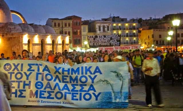 Χιλιάδες πολίτες κινητοποιήθηκαν και χθες, Πέμπτη, 5/6, στα Χανιά, ενάντια στην καταστροφή του χημικού οπλοστασίου της Συρίας στα νερά της Μεσογείου, σε συνέχεια παγκρήτιων συγκεντρώσεων αλλά και εν πλω διαμαρτυριών, που δονούν εδώ και μήνες την Κρήτη, έχουν όμως περάσει στα ψιλά των ΜΜΕ. Σύμφωνα με το σχέδιο του Διεθνούς Οργανισμού για την Καταστροφή των Χημικών Όπλων, υπό την αιγίδα του ΟΗΕ, το χημικό οπλοστάσιο της Συρίας πρόκειται να καταστραφεί με τη μέθοδο της υδρόλυσης εν πλω, στο πλαίσιο μιας στρατιωτικής επιχείρησης που θα λάβει χώρα σε απόσταση 200 μιλίων δυτικά της Κρήτης, στα διεθνή ύδατα μεταξύ Ελλάδας, Ιταλίας, Λιβύης και Μάλτας. Πρόκειται για μια πιλοτική μέθοδο, που θα εφαρμοστεί πρώτη φορά, καθώς κανένα.. κράτος δε δέχτηκε να λάβει χώρα η διαδικασία σε εγκαταστάσεις στο έδαφός του. Τα επίσημα χρονοδιαγράμματα προβλέπουν ότι η διαδικασία πρέπει να έχει ολοκληρωθεί μέχρι τα μέσα του 2014, γεγονός που καθιστά τον επόμενο μήνα κρίσιμο για εξελίξεις. Επιστήμονες και περιβαλλοντικές οργανώσεις κρίνουν τη διαδικασία ως ιδιαιτέρως επισφαλή, καταγγέλοντας την απροθυμία των αρμόδιων αρχών να παράσχουν συγκεκριμένη ενημέρωση, ακόμα και για τον ακριβή χρόνο που θα λάβει χώρα η επιχείρηση, πόσο μάλλον για το αν έχει γίνει μελέτη περιβαλλοντικών επιπτώσεων. «Οι κίνδυνοι που ελλοχεύουν είναι τεράστιοι και η οικολογική καταστροφή ασύλληπτη. Μέχρι στιγμής τα αποτελέσματα ενός τέτοιου πειράματος σύμφωνα με τους επιστήμονες ενδέχεται μακροπρόθεσμα να οδηγήσουν σε τερατογενέσεις, καρκίνους οποιασδήποτε μορφής και νέκρωση κάθε ζωντανού οργανισμού στο θαλάσσιο περιβάλλον της μεσογείου», αναφέρει σε παλιότερη ανακοίνωσή του το Ανοιχτό Συντονιστικό Χανίων Κατά των Χημικών του Πολέμου, και συνεχίζει καταγγέλοντας τη σιωπή των ΜΜΕ: «Θα περίμενε κανείς πως ένα τόσο σοβαρό ζήτημα αν μη τι άλλο θα ευαισθητοποιούσε το χώρο της ενημέρωσης, όμως τα πανελλαδικής εμβέλειας ΜΜΕ σιωπούν προκλητικά. Στην υπόλοιπη Ελλάδα ο κόσμος αγνοεί τα γεγονότα,αφού φυσικά η πλήρης αδιαφάνεια, η συγκάλυψη και η εκκωφαντικά σιωπηλή ενημέρωση αποτελούν το πλαίσιο πραγμάτωσης του εγκλήματος. Δεν είναι λίγοι ωστόσο εκείνοι που αδυνατούν να αποδεχτούν το γεγονός πιστεύοντας πως πρόκειται για ‘φήμη’ ή σενάριο επιστημονικής φαντασίας αφού οι ιθύνοντες αρνούνται να το σπουδαιολογήσουν φοβούμενοι να αποκαλύψουν το έγκλημα. Την ίδια στιγμή το δήθεν ανεξάρτητο κατεστημένο των μεγαλοδημοσιογράφων… της χώρας σφυρίζει αδιάφορα».