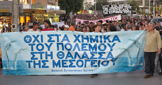 Χιλιάδες πολίτες κινητοποιήθηκαν και χθες, Πέμπτη, 5/6, στα Χανιά, ενάντια στην καταστροφή του χημικού οπλοστασίου της Συρίας στα νερά της Μεσογείου, σε συνέχεια παγκρήτιων συγκεντρώσεων αλλά και εν πλω διαμαρτυριών, που δονούν εδώ και μήνες την Κρήτη, έχουν όμως περάσει στα ψιλά των ΜΜΕ.
