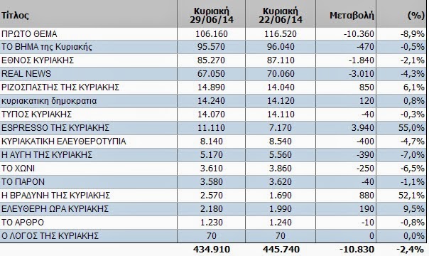 Στον πίνακα (πατήστε για μεγέθυνση) το επίσημο δελτίο με τις κυκλοφορίες των εφημερίδων τις δύο τελευταίες Κυριακές. Δεν υπάρχουν οι κυκλοφορίες της Καθημερινής καθώς ο Αλαφούζος δεν θέλει να δίδονται στη δημοσιότητα...