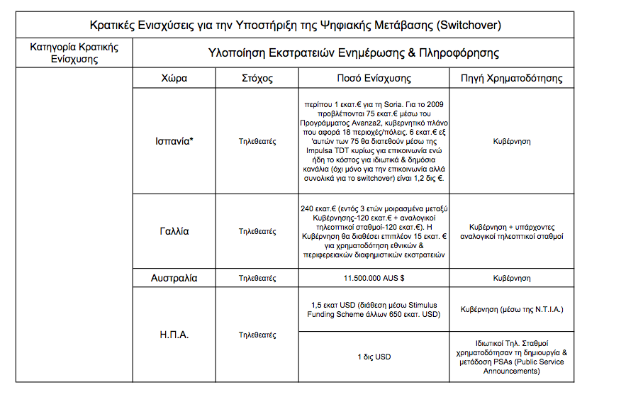 Συνοπτικά θα κατατάσσαμε τις κρατικές ενισχύσεις σε δύο κατηγορίες (παρότι όπως αναφέραμε ανωτέρω οι ωφελημένοι μπορεί να είναι πολύ περισσότεροι) : σε αυτές που απευθύνονται στους πολίτες και σε αυτές που απευθύνονται στους τηλεοπτικούς οργανισμούς και τις εταιρίες διαχείρισης δικτύων. Προς όφελος των καταναλωτών είναι η ενημέρωση και η εκπαίδευση για τη χρήση του ψηφιακού τηλεοπτικού εξοπλισμού. Οι εκστρατείες ενημέρωσης και πληροφόρησης είναι συνήθως κεντρικά σχεδιασμένες ακόμα και στις περιπτώσεις όπου ο φορέας υλοποίησης της εκστρατείας δεν είναι η κυβέρνηση αλλά οι ειδικοί οργανισμοί όπως ο Digital UK στο Ην. Βασίλειο, η TNT στη Γαλλία, η Impulsa TDT στην Ισπανία κ.α., και τις περισσότερες φορές είναι κρατικά χρηματοδοτούμενες.