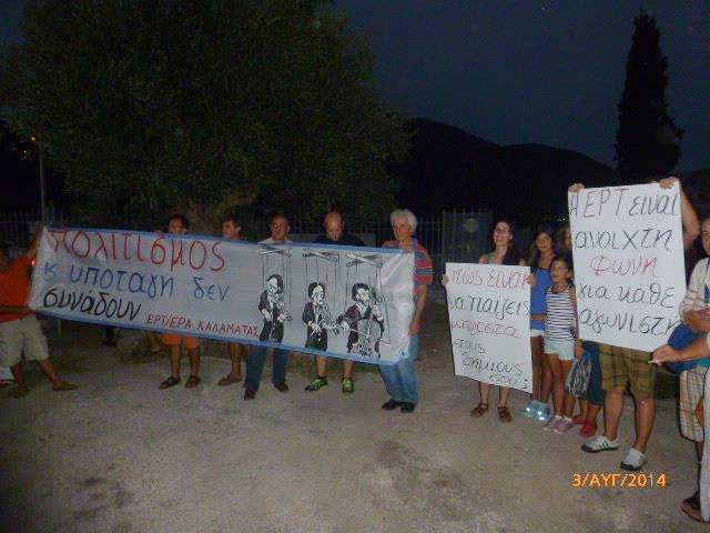 «Πολιτισμός και υποταγή δε συνάδουν»: Διαμαρτυρία της ΕΡΑ Καλαμάτας στην Αρχαία Μεσσήνη«Πολιτισμός και υποταγή δεν συνάδουν» έγραφε το πανό στην είσοδο του αρχαιολογικού χώρου στην Μεσσήνη, το οποίο απεικόνιζε μουσικούς μαριονέτες, και έστησαν οι παρανόμως απολυμένοι εργαζόμενοι της ΕΡΑ Καλαμάτας και αλληλέγγυοι της ΕΡΤ, διαμαρτυρόμενοι για την συναυλία της Συμφωνικής Ορχήστρας της ΝΕΡΙΤ στο αρχαίο θέατρο.