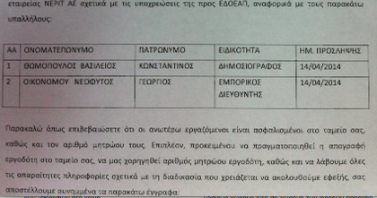 είναι ο μόνος που έχει προσληφθεί κανονικά. Το έγγραφο που έφθασε σύμφωνα με πληροφορίες μας, στον ΕΔΟΕΑΠ πιστοποιεί τις δυο προσλήψεις της ΝΕΡΙΤ στην Αθήνα. Ζητά στοιχεία για τα δυο μέλη, της ΕΣΗΕΑ και ΕΠΗΕΑ αντίστοιχα για να αρχίσει η καταβολήτ των ασφαλιστικών εισφορών! Όλα τα άλλα στελέχη που συνεχίζουν να παρέχουν καλές υπηρεσίες στην κυβέρνηση, είτε δουλεύοντας ως "μαύροι", είτε ως "συμβασιούχοι" της Αφροδίτης Γουγά, συνωστίζονται στη γραμμή επιλογής των λίγων προσλήψεων. Πολλές φορές καρφώνοντας ο ένας τον άλλον και καταγγέλλοντας ο ένας τον άλλον.
