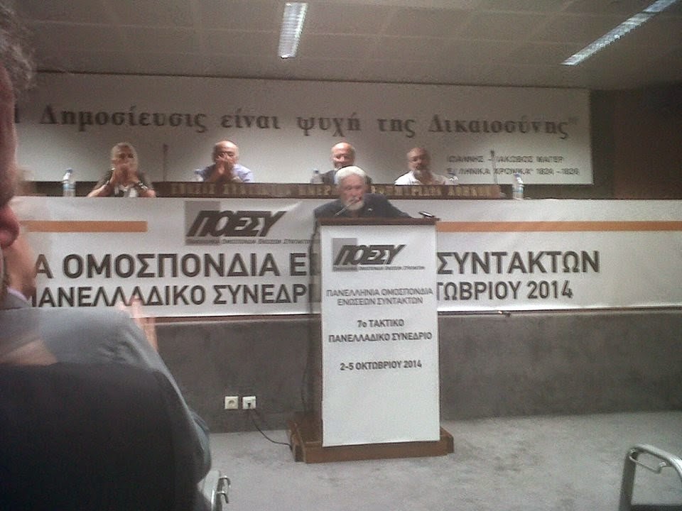 Να μην παραδώσουμε την Ομοσπονδία σε κυβέρνηση και τρόϊκα με τον έλεγχό της από τους μνημονιακούς συνδικαλιστές που έχουν υπόγειες σχέσεις με το Μαξίμου, δίπλα στις υπάκουες διοικήσεις των Ενώσεων. Χαρακτηριστική αναφορά συνέδρου της ΠΟΕΣΥ κατά τις τοποθετήσεις την πρώτη μέρα των εργασιών του 7ου τακτικού συνεδρίου της Ομοσπονδία, η οποία ήταν αφιερωμένη στον απολογισμό των οργάνων κατά την προηγούμενη τριετία και στις προτάσεις για διεύρυνση της Ομοσπονδίας.