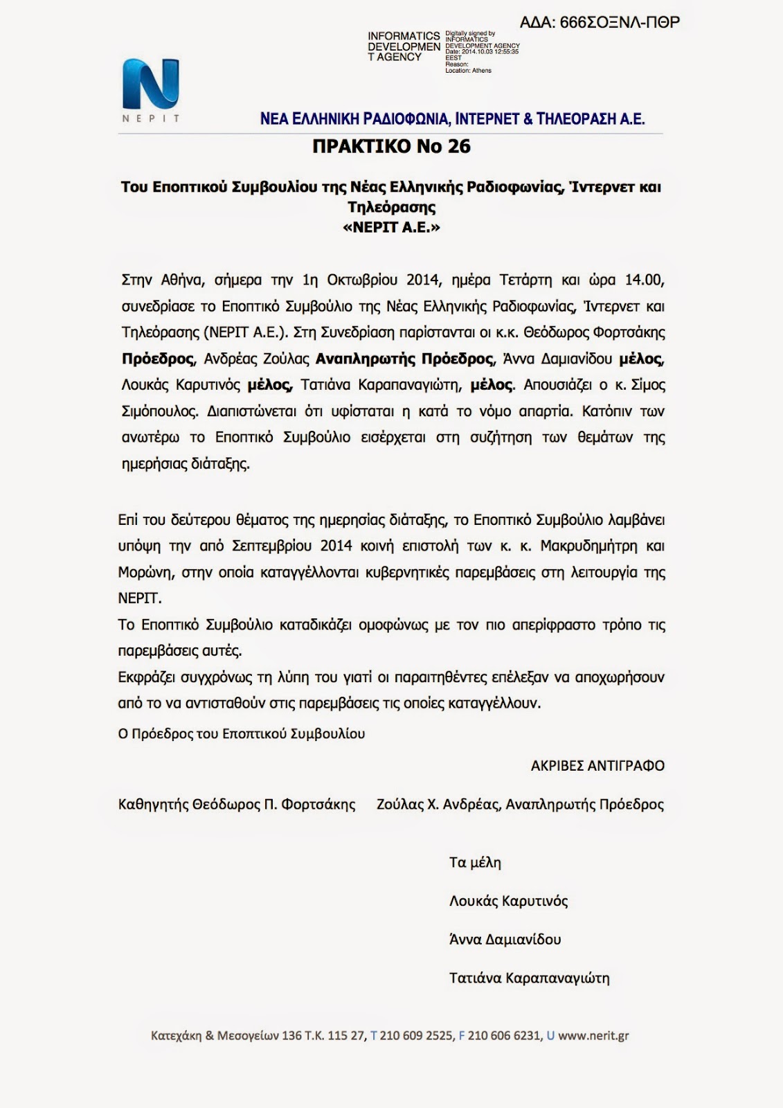 «Το Εποπτικό Συμβούλιο, λαμβάνοντας υπόψη την κοινή επιστολή των κ. Μακρυδημήτρη και Μορώνη, στην οποία καταγγέλλονται κυβερνητικές παρεμβάσεις στη λειτουργία της ΝΕΡΙΤ, καταδικάζει ομόφωνα, με τον πιο απερίφραστο τρόπο, τις παρεμβάσεις αυτές.