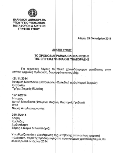 @Το δελτίο Τύπου από το υπουργείο Μεταφορών για την αναβολή της μεθαυριανής ψηφιακής μετάβασης σε Κεντρική Μακεδονία, Στερεά Ελλάδα και Θεσσαλία εκδόθηκε και το λάβαμε μέσω της ιστοσελίδας της Digea. Ο λόγος που επικαλείται το υπουργείο Μεταφορών που αυτή τη φορά δεν εξέδωσε υπουργική απόφαση αλλά μια απλή ανακοίνωση, είναι πως η αναβολή δίδεται για "τεχνικούς λόγους". Χωρίς άλλη εξήγηση. Και αναρωτιόμαστε. Έχουν σχέση οι πληροφορίες ότι η Digea ζητά ομολογιακό δάνειο ύψους 12 εκατ. ευρώ για να επενδύσει σε πομπούς; Ή φταίει πως τα περιφερειακά κανάλια της Θεσσαλονίκης και Χαλκιδικής δεν υποράφουν τη σύμβαση με τη Digea; Ισχύουν άραγε και τα δυο; Η νιοστή αναβολή της ψηφιακής μετάβασης στην τηλεόραση ρεζιλεύει για μια ακόμη φορά το κράτος, την κυβέρνηση και τα (υποτίθεται) θεσμικά όργανα ελέγχου της αγοράς. Χαρακτηριστικά και μόνο αναφέρουμε πως η ΕΕΤΤ οργάνωσε φιέστα για την πώληση των τηλεοπτικών συχνοτήτων, του ψηφιακού μερίσματος, στις εταιρείες κινητής τηλεφωνίας. Για να περηφανευτεί πως το ΤΑΙΠΕΔ θα πάρει 380 εκατ. ευρώ. Για την χορήγηση όλων των άλλων τηλεοπτικών συχνοτήτων στη Digea όχι μόνο δεν οργανώθηκε κάποια συνάντηση αλλά ούτε καν η άδεια παραχώρησης δεν έχει δημοσιευτεί. @Τις νέες ημερομηνίες της ψηφιακής μετάβασης που δίνονται με δελτίο Τύπου μπορείτε να δείτε στη φωτογραφία δίπλα. Μια επισήμανση όμως. Η ολοκλήρωση της ψηφιακής τηλεόρασης ορίζεται η 29η Δεκεμβρίου του 2014. Ακριβώς την ίδια ημερομηνία του 2013 είχε ανακοινωθεί ο διαγωνισμός παραχώρησης των ψηφιακών συχνοτήτων! Στον οποίο όπως όλοι θυμόμαστε αίτηση ενδιαφέροντος κατέθεσε μόνο η Digea. Η εταιρεία η οποία είχε αναλάβει από το 2009 το μεταβατικό στάδιο της επίγειας ψηφιακής τηλεόρασης.