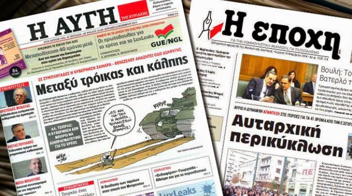 «Μεταξύ Τρόικας και κάλπης», ο τίτλος της Αυγής - «Αυταρχική περικύκλωση», ο τίτλος της Εποχής αλλά και πολιτικά πρωτοσέλιδα πριν τις εκλογές που έρχονται...