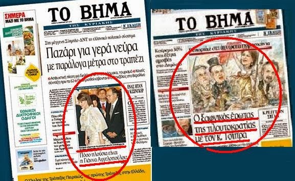 Το ΒΗΜΑ υπό τον πρωτοσέλιδο τίτλο «Πόσο πλούσια είναι η Γιάννα Αγγελοπούλου;» αναφέρεται και πάλι στις επαφές της με τον ΣΥΡΙΖΑ και την πρόσφατη συνάντηση της με τον Αλέξη Τσίπρα στην Βουλή. Γεγονός που έδωσε -όπως λέει ο πονηρός ο κυρ Σταύρος- τροφή σε σενάρια και υποθέσεις για τις επιδιώξεις της και για το τι ακριβώς συζήτησαν.