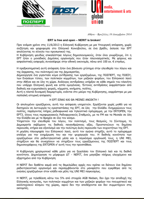 Στην οξεία κριτική που ασκούν στη συγκεκριμένη απόφαση με την ανακοίνωσή τους τα σωματεία καλούμε την EBU «να σταματήσει να υποστηρίζει την ελεγχόμενη από την κυβέρνηση ΝΕΡΙΤ και να στηρίξει τους Έλληνες εργαζόμενους και τους δημοσιογράφους της ERTOPEN, ενισχύοντας μια αληθινά ανεξάρτητη δημόσια ραδιοτηλεόραση».