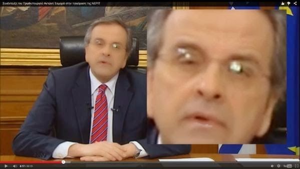 Ο πρωθυπουργός Αντώνης Σαμαράς, έδωσε συνέντευξη....... 1ον.....ΜΑΓΝΗΤΟΣΚΟΠΗΜΕΝΗ, να μπορεί να μονταριστεί από τυχόν πράγματα που δεν θα έπρεπε να ειπωθούν δημόσια 2ον...ΣΤΗΝ ΝΕΡΙΤ, στο δημιούργημα Σαμαρά, το 100% ελεγχόμενο μόρφωμα από την κυβέρνηση. 3ον,,,,ΜΕ ΔΗΜΟΣΙΟΓΡΑΦΟΥΣ-ΓΛΑΣΤΡΕΣ, μιλιά δεν έβγαζαν, πέραν των έτοιμων ερωτήσεων που τους είχαν δώσει, μη επιτρέποντας τους ούτε καν να κλείσουν την "συνέντευξη", πράγμα που έκανε ο ίδιος ο Σαμαράς και
