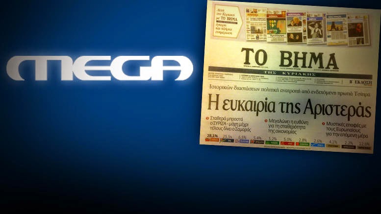 Ας τα πάρουμε όμως με τη σειρά. Το «Βήμα της Κυριακής» κυκλοφορεί με πρωτοσέλιδο τίτλο «Η ευκαιρία της Αριστεράς». Πάει η εποχή που με αντίστοιχα γράμματα διαβάζαμε ότι «Ο Τσίπρας είναι Στάλιν». Μάλιστα τη γραμμή δίνει αυτοπροσώπως ο διευθυντής της εφημερίδαςΑντώνης Καρακούσης, ο οποίος προεξοφλεί τη νίκη του ΣΥΡΙΖΑ στις επερχόμενες εκλογές, επιχειρώντας μάλιστα ιστορική σύγκριση με τις εκλογεύς του 1936 οι οποίες είχαν γίνει κι αυτές μήνα Ιανουάριο. Στον έτερο κορυφαίο πόλο της διαπλοκή, το Mega, οι εξελίξεις είναι επίσης ραγδαίες και σουρεαλιστικές. Οι εκδότες του Mega αποφάσισαν φιλική «κυβίστηση» προς τον ΣΥΡΙΖΑ. Εδώ αρχίζει ο σουρεαλισμός. Τη στροφή αναλαμβάνει να υλοποιήσει η... Όλγα Τρέμη, η οποία αποχώρησε τον Ιούλιο με την κατηγορία της «τροϊκανής» δημοσιογράφου. Στο πλευρό της (ελπίζουμε άοπλος και χωρίς μπαζούκας) ο γνωστό Νίκος Ευαγγελάτος.