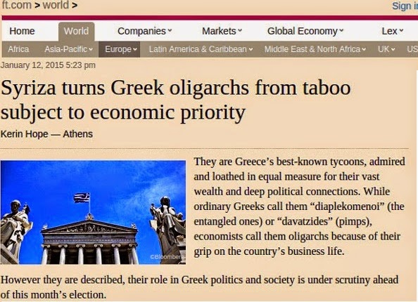 Με αφορμή τις δηλώσειςτου στελέχους του ΣΥΡΙΖΑ Γιώργου Σταθάκη, που δήλωσε στους Financial Times ότι ο ΣΥΡΙΖΑ θα βάλει τέλος στην δωρεάν έκδοση αδειών για τηλεοπτικά κανάλια σε πολιτικούς «φίλους» και θα επανεξετάσει διαφιλονικούμενες ιδιωτικοποιήσεις, η βρετανική εφημερίδα αναφέρεται τώρα και στον ρόλο των «ολιγαρχών» (και μιντιαρχών) στην ελληνική πολιτική και κοινωνία.