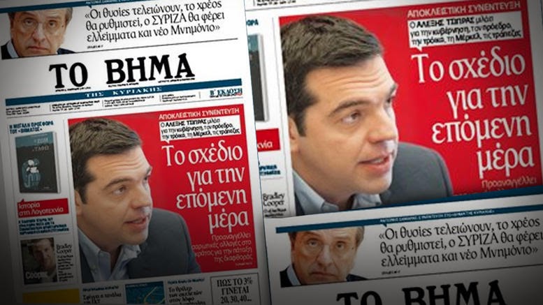 Με τον Αλέξη Τσίπρα σε πρώτο...πρωθυπουργικό πλάνο και τις εξαγγελίες του για το «σχέδιο» του ΣΥΡΙΖΑ για την επόμενη μέρα, μέσα σε ένα βαθύ κόκκινο φόντο, κυκλοφορεί αύριο το ΒΗΜΑ της Κυριακής. Το πρωτοσέλιδο της εφημερίδας έρχεται να επιβεβαιώσει την ...ταχύτητα με την οποία ο Δημοσιογραφικός 'Ομιλος Λαμπράκη παραδοσιακά αλλάζει «σημαίες ευκαιρίας» πριν το επόμενο καράβι της εξουσίας, εμφανιστεί στον κάβο. Ο επιχειρούμενος εναγκαλισμός του συγκροτήματος με την «κυβέρνηση της Αριστεράς» έγινε δημόσιος στις αρχές του Ιανουαρίου όταν το ΒΗΜΑ της Κυριακής «πριμοδότησε» με επίσης πρωτοσέλιδο δημοσίευμα την «Ευκαιρία της Αριστεράς» κρίνοντας ως «ιστορικών διαστάσεων» την «πολιτική ανατροπή από ενδεχόμενη πρωτιά Τσίπρα». Στον ΔΟΛ τηρούν με θρησκευτική ευλάβεια τις παραδόσεις τους. Ακόμη και στις κυβιστήσεις. Που έχουν παρελθόν και μάλλον και μέλλον