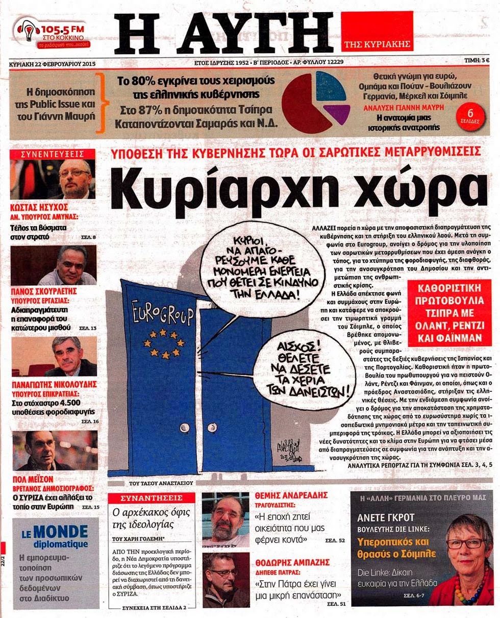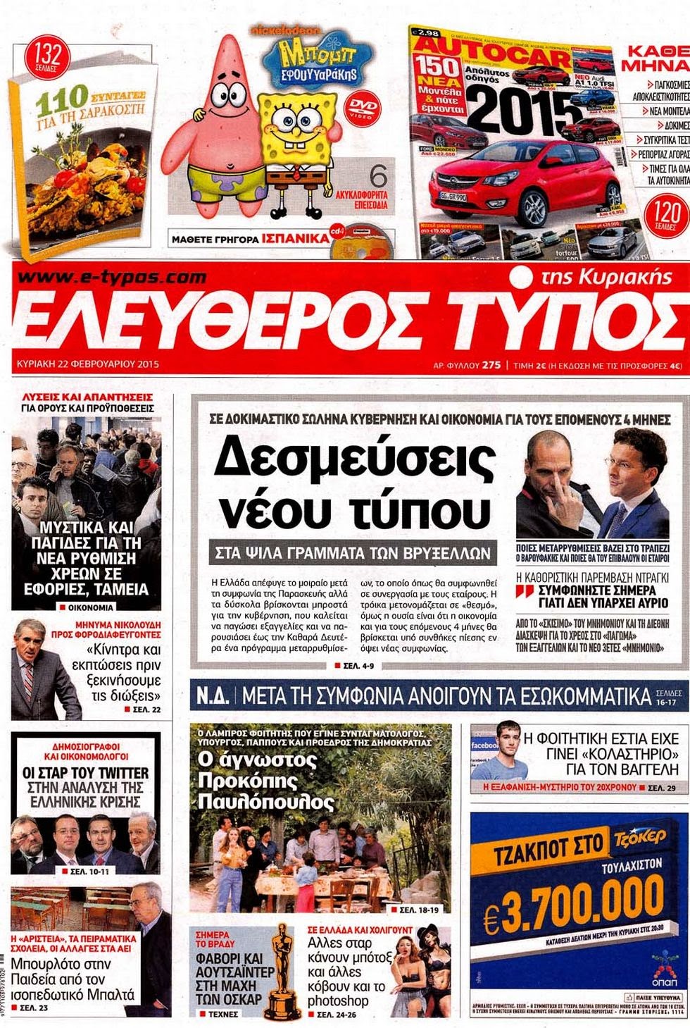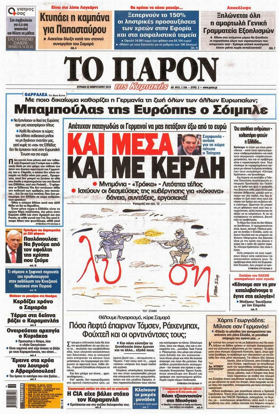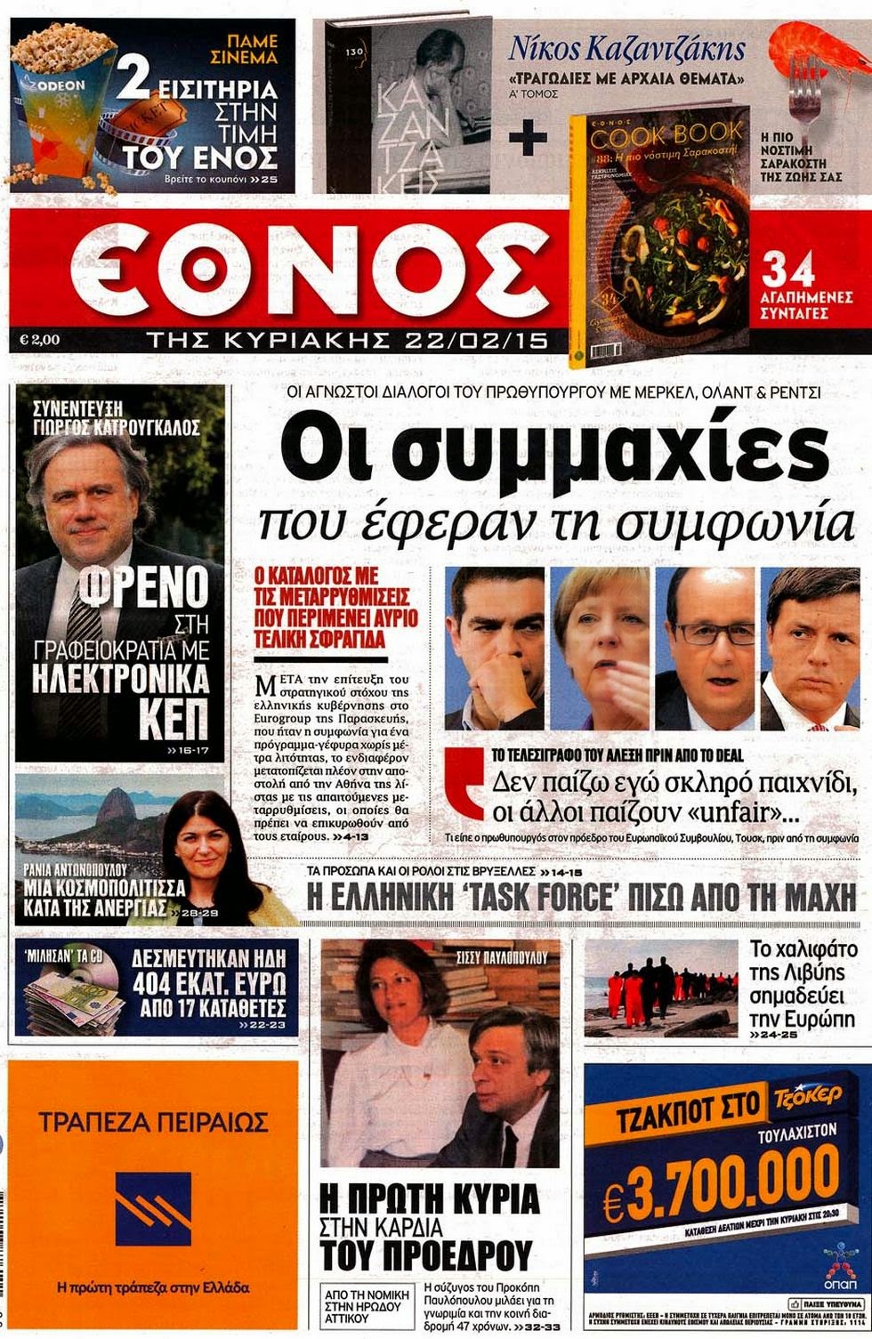 Τα πρωτοσέλιδα των Κυριακάτικων 22/2/2015 πολτικών εφημερίδων