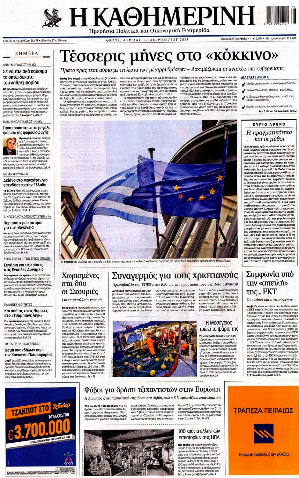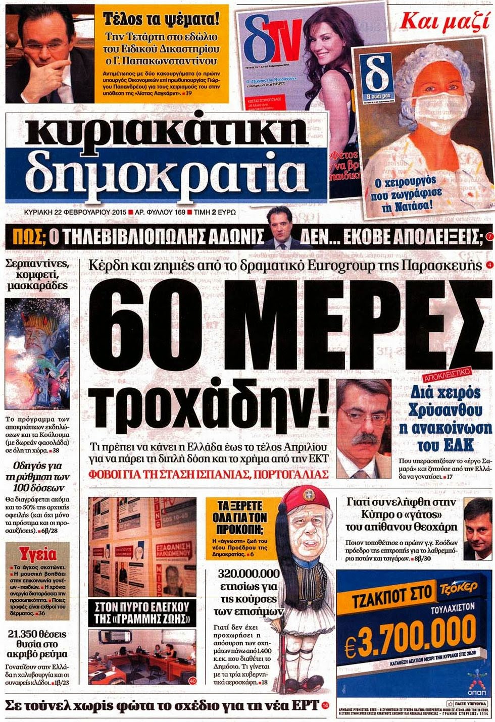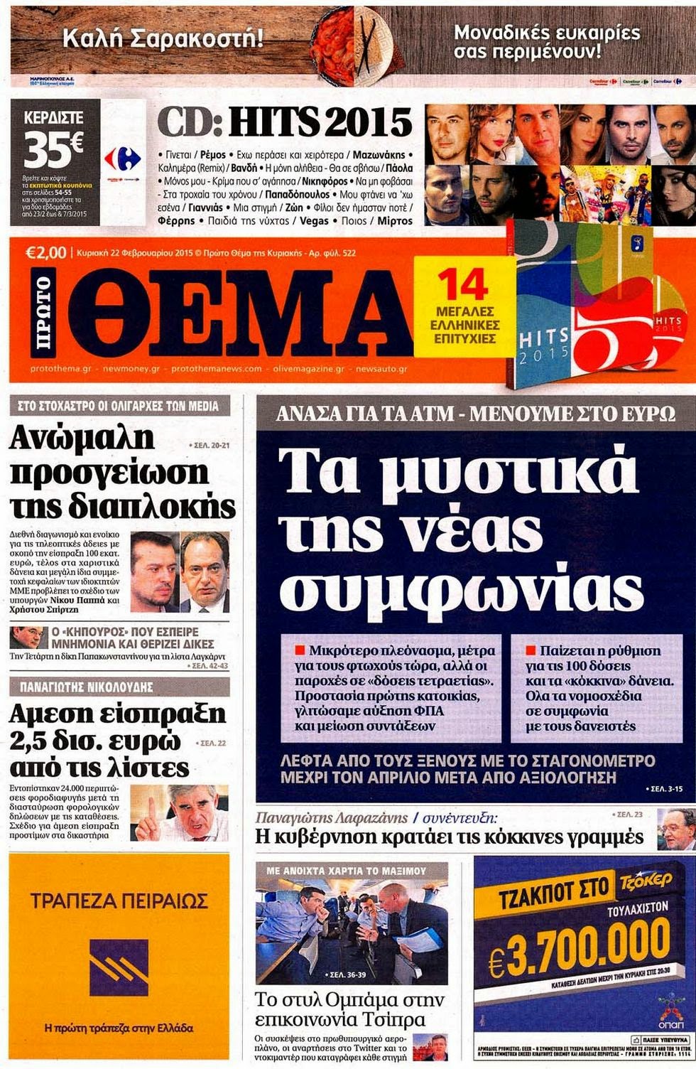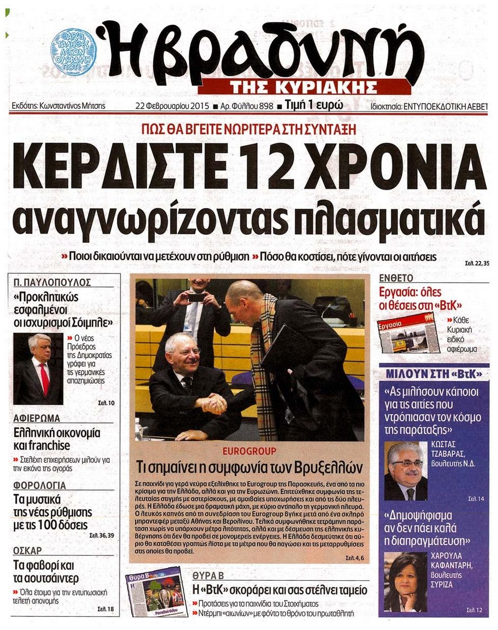Τα πρωτοσέλιδα των Κυριακάτικων 22/2/2015 πολτικών εφημερίδων
