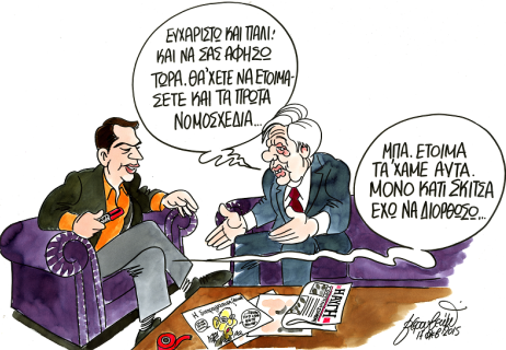 Για να δείτε πόσο μάγκες είναι(;) στην «Αυγή». Μετά το σκίτσο του Τάσου Αναστασίου με τον Σόιμπλε που προκάλεσε αντιδράσεις Γερμανών, Εβραίων κλπ -και ανάγκασε τον Τσίπρα στην ΚΟ να κάνει λόγο (ας όψεται το Eurogroup) για ατυχέστατη στιγμή- η εφημερίδα δημοσίευσε την περασμένη Τετάρτη ένα άλλο σκίτσo του Βαγγέλη Χερουβειμ... που τρολάριζε τον αρχηγό του ΣΥΡΙΖΑ και πρωθυπουργό Αλέξη Τσίπρα. (Δείτε τα και βγάλτε τα συμπεράσματά σας...) Αραγε ο Τσίπρας γνώριζε περί του νέου σκίτσου και ειχε ερωτηθεί για τη δημοσίευσή του; Κάποιοι είπαν πως ο πρωθυπουργός ήταν ενήμερος και δεν δίστασε να τρολάρει και τον εαυτό του σε μια.. προσπαθεια να «εξιλεωθεί» για τις δηλώσεις του σχετικά με το σκίτσο του Αναστασίου...