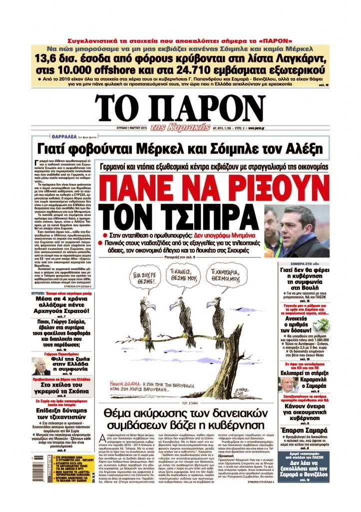 Παράλληλα, οι δανειστές «απαγόρευσαν» ρητά στην κυβέρνηση να προχωρήσει στην έκδοση εντόκων γραμματίων πέραν του ποσού που δικαιούται, κάτι που σημαίνει ότι μέχρι το τέλος Απριλίου θα είναι κλειστές όλες οι πηγές χρηματοδότησης. Στο μεταξύ, και το ΔΝΤ, επικαλούμενο τον κανονισμό λειτουργίας, αρνείται να δώσει στη χώρα μας παράταση ολίγων ημερών ή εβδομάδων για την αποπληρωμή της δόσης του Μαρτίου. Ενώ, όπως επισημαίνουν οικονομικοί παράγοντες, αν ήθελε η ηγεσία του Ταμείου θα μπορούσε να βρει το «παραθυράκι» και να παρακάμψει τις σχετικές διαδικασίες. Στην κυβέρνηση είναι πεπεισμένοι ότι πίσω από τη στάση αυτή του ΔΝΤ βρίσκεται -ποιος άλλος;- η Γερμανία και ο Β. Σόιμπλε, αλλά και ντόπιοι κουκουλοφόροι.