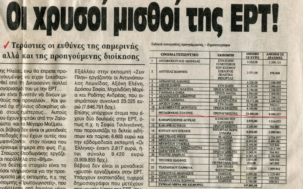 @Μια αποκάλυψη του «Π» του… 2002 προκαλεί πολιτικό θέμα 13 χρόνια αργότερα. Ο λόγος για την αμοιβή του Σταύρου Θεοδωράκη, επικεφαλής του Ποταμιού, ως δημοσιογράφου για την εκπομπή «Πρωταγωνιστές» στην ΕΡΤ (ΝΕΤ). Το θέμα έφερε στην επιφάνεια ο διευθυντής του σταθμού Στο Κόκκινο Κώστας Αρβανίτης, απαντώντας σε ανακοίνωση του Ποταμιού για στελέχη του ΣΥΡΙΖΑ που γνωρίζουν τα περί σπατάλης στην ΕΡΤ, δημοσιεύοντας τη δική του σύμβαση στην ΕΡΤ ΑΕ αλλά και δημοσίευμα του «Π» της 8ης Δεκεμβρίου 2002. Είχε προηγηθεί η δημόσια καταγγελία του προέδρου των ΑΝΕΛ και υπουργού Εθνικής Άμυνας Πάνου Καμμένου, μέσα στο Κοινοβούλιο, η οποία αφορούσε τη συνεργασία και την αμοιβή του Σταύρου Θεοδωράκη στην ΕΡΤ. Μετά την ανακοίνωση του Κ. Αρβανίτη το internet πήρε φωτιά. Το έγγραφο που είχε δημοσιεύσει η εφημερίδα μας προερχόταν από την ΕΡΤ και κατέγραφε μεν τη μισθοδοσία δημοσιογράφων της εταιρείας, αναφερόταν όμως και συγκεκριμένα στην εκπομπή που εργαζόταν ο Σταύρος Θεοδωράκης επί προεδρίας Άγγελου Στάγκου και κυβέρνησης Σημίτη. Ο Σταύρος Θεοδωράκης αμειβόταν με 23.490 ευρώ (μεικτά), η συνεργάτιδά του Γκέλη Βούρβουλη με 5.194 ευρώ (μεικτά) και ο Πέτρος Παραγυός με 2.245 ευρώ (μεικτά). Η εκπομπή «Πρωταγωνιστές» είχε ξεκινήσει επί διοικήσεως Π. Παναγιώτου στην ΕΡΤ και πήρε έγκριση και από τον Άγγελο Στάγκο, με μειωμένο κόστος όπως ανέφεραν οι πληροφορίες. Ο Σταύρος Θεοδωράκης, εκ των επικριτών της κακοδαιμονίας του Δημοσίου, οφείλει πλέον, με την ευθύνη του κόμματος που εκπροσωπεί, να παρουσιάσει όλα τα στοιχεία για το είδος της συνεργασίας που είχε με την ΕΡΤ, με την εκπομπή «Πρωταγωνιστές», όπως και για το αν επρόκειτο για μεικτή παραγωγή ή εξωτερική, ποια ήταν η εταιρεία παραγωγής, ποια ήταν η συνεισφορά της και ποιο το καθεστώς των αμοιβών. Επιπλέον, οφείλει να ξεκαθαρίσει αν υπήρξαν τροποποιήσεις επί του αρχικού κόστους της σύμβασης. Έτσι, υπεύθυνα, θα προσδιορίσει με απόλυτο τρόπο το είδος της συνεργασίας που είχε με το Δημόσιο και ειδικά με την ΕΡΤ το συγκεκριμένο χρονικό διάστημα.