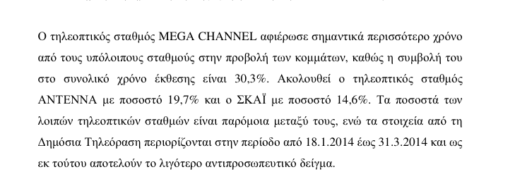 Για αρκετές εβδομάδες μετά την εκλογική αναμέτρηση της 25ης Ιανουαρίου τα τηλεοπτικά κανάλια στις ειδήσεις και στις ενημερωτικές εκπομπές τους δεν μιλούσαν για «κυβέρνηση ΣΥΡΙΖΑ» αλλά μόνο για «ΣΥΡΙΖΑ». Η πολιτική επιλογή της αμέριστης στήριξης στα κόμματα της προηγούμενης κυβέρνησης (ΝΔ – ΠΑΣΟΚ) καταδεικνύεται και ποσοτικά μέσα από την ετήσια Έκθεση Πολιτικής Πολυφωνίας που κατατέθηκε στη Βουλή από το Εθνικό Συμβούλιο Ραδιοτηλεόρασης. Τα στοιχεία της πολυσέλιδης έκθεσης δείχνουν πως το κόμμα της ΝΔ είχε σχεδόν διπλάσια υποστήριξη από αυτό του ΣΥΡΙΖΑ καθ’ όλη τη διάρκεια της χρονιάς παρότι ο ΣΥΡΙΖΑ στις ευρωεκλογές ήταν πρώτο κόμμα. Από την έκθεση προκύπτει πως το κόμμα της ΝΔ υπό τον Αντώνη Σαμαρά είχε τη μαζική υποστήριξη των τηλεοπτικών σταθμών. Στο σύνολο των τηλεοπτικών δελτίων ειδήσεων η ΝΔ καταλαμβάνει το 38,5% του τηλεοπτικού χρόνου. Η κυβέρνηση, χωρίς το κόμμα της ΝΔ, κατέχει το 3,2%, ενώ το ΠΑΣΟΚ, ως δεύτερος πρώην κυβερνητικός εταίρος, καταλαμβάνει το 12,4% της τηλεοπτικής παρουσίας. Συνολικά, δηλαδή, τα κόμματα της προηγούμενης συγκυβέρνησης ΝΔ – ΠΑΣΟΚ είχαν το 54,1% του χρόνου στα δελτία ειδήσεων των καναλιών. Αθροιστικά, τα δύο κόμματα στις εκλογές του Ιουνίου του 2012 είχαν το 41,94% του εκλογικού σώματος. Αποδεικνύεται με αριθμούς πως η ιδιωτική τηλεόραση τάχθηκε ανοικτά υπέρ του προηγούμενου κυβερνητικού σχήματος, δίνοντας επιπλέον 8,8% του τηλεοπτικού χρόνου στη ΝΔ και 0,1% στο ΠΑΣΟΚ. Ο ΣΥΡΙΖΑ, διατηρώντας πολιτική εμπάργκο στη ΝΕΡΙΤ για το 2014, είναι το δεύτερο κόμμα στη γενική κατάταξη της πολιτικής πολυφωνίας. Οι εκπρόσωποί του κατέχουν το 23,8% του χρόνου στα δελτία ειδήσεων της ιδιωτικής τηλεόρασης. Το κόμμα των ΑΝΕΛ, ο σημερινός κυβερνητικός εταίρος, είχε μόλις το 4,7% του χρόνου στα δελτία, όσο και η ΔΗΜΑΡ. Η Χρυσή Αυγή υποχώρησε στο 4,1%, το ΚΚΕ στο 3,8% και τα λοιπά κόμματα, στα οποία περιλαμβάνεται και το Ποτάμι, το 4,8%. TYPOLOGIES.