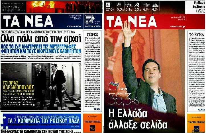 Θυμάστε το πρωτοσέλιδο λέι άουτ που είχαν «Τα Νέα» και «Το Βήμα» αμέσως μετά την εκλογική νίκη του Σύριζα; Εκείνο το λέι άουτ που σου έφερνε στο μυαλό και τραγουδούσες το «Βάλε το κόκκινο φουστάνι, εκείνο που σε κάνει να μοιάζεις πυρκαγιά». Τώρα το πράγμα άλλαξε. Άλλωστε εδώ και δεκαετίας όλα, όλο αλλάζουν στη Μιχαλακοπούλου και παλιότερα στη Χρήστου Λαδά. Και εσχάτως οι χρωματική αισθητική των πρωτοσέλιδων ευθυγραμμίζεται με την κατεύθυνση της πολιτικής γραμμής που μετακινείται σαν τα νερά του Ευρίπου. Έτσι πλέον κυριαρχεί διαφορετικό χρώμα στις πρώτες σελίδες, με αποκορύφωμα τη σημερινή έκδοση των «Νέων». Τα οποία καθημερινά επιτίθενται από παντού (από το πρωτοσέλιδο άρθρο, από το οπισθόφυλλο, από τις εσωτερικές σελίδες) στο κυβερνητικό όλον. Το φάσμα των επιθέσεων.. αρχίζει από τους «ακροδεξιούς ΑΝ.ΕΛ» έως τα ροζέ ή στα κατακόκκινα στελέχη της κυβέρνησης. Πάει το μετεκλογικό κόκκινο, εξαφανίστηκε! Τώρα το τραγούδι και ο στίχος άλλαξαν: «Μπλε μπλε μπλε, μπλε μπλε μπλε, πώς του παν’ καλέ τα μπλε»!