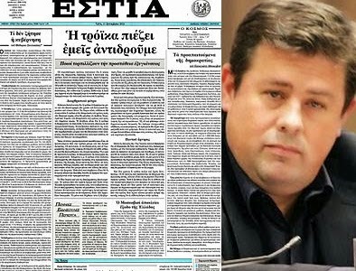 Αποφασισμένη να ανατρέψει τα δεδομένα της τηλεοπτικής αγοράς φαίνεται η κυβέρνηση, «στριμώχνοντας» τους ιδιοκτήτες των σταθμών και πρμοδοτώντας τη συμμετοχή νέων «παικτών». Τη δεδομένη απόφασή της επιτάχυνε η επίθεση που δέχθηκε ο υπουργός Δημόσιας Διοίκησης Γιώργος Κατρούγκαλος -επίθεση την οποία το πρωθυπουργικό επιτελείο θεώρησε «αιτία πολέμου». Έτσι, ο υπουργός Επικρατείας Νίκος Παππάς προώθησε αμέσως τη ρύθμιση για την είσπραξη του 2% επί του τζίρου κάθε σταθμού, αναδρομικά από το 2011, για τη χρήση των συχνοτήτων. Σύνολον περίπου 40 εκατ ευρώ. Ακολουθεί ο έλεγχος των τραπεζικών δανείων κάθε καναλιού και, βέβαια, ο διαγωνισμός για.. τις τηλεοπτικές άδειες. Στον διαγωνισμό η κυβέρνηση ευελπιστεί ότι θα πάρουν μέρος και επιχειρηματίες, πέραν εκείνων που δραστηριοποιούνται στα τηλεοπτικά πράγματα, τα τελευταία χρόνια. Μεταξύ αυτών η Γιάννα Αγγελοπούλου, ο πρόεδρος του Ολυμπιακού Βαγγέλης Μαρινάκης, ίσως ο Βαγγέλης Μυτιληναίοςκαι ο Δημήτρης Γιαννακόπουλος. - aixmi @ Αλλάζει χέρια η«Εστία», η μοναδική καθημερινή εφημερίδα που δεν ακολούθησε τη μεταρρύθμιση της ελληνικής ορθογραφίας που έγινε το 1982 και ακόμα χρησιμοποιεί το πολυτονικό σύστημα. Η αλλαγή στο ιδιοκτησιακό καθεστώς της ιστορικής εφημερίδας (εκδόθηκε το 1894) έγινε γνωστή μετά από ανακοίνωση της A.E. «ΔΗΜΟΚΡΑΤΙΚΟΣ ΤΥΠΟΣ», της εκδοτικής επιχείρησης του Γιάννη Φιλιππάκη, που δραστηριοποιείται στον ημερήσιο τύπο (εκδίδει τις εφημερίδες «Δημοκρατία» και «Espresso»). Η εταιρεία ανακοίνωσε την συμμετοχή της στην "ΕΣΤΙΑ", αναφέροντας χαρακτηριστικά: «H A.E. ΔΗΜΟΚΡΑΤΙΚΟΣ ΤΥΠΟΣ, η μεγαλύτερη εκδοτική επιχείρηση που δραστηριοποιείται στον ημερήσιο τύπο, ανακοινώνει την συμμετοχή της στην ΄΄Α.Ε.Ε. ΕΦΗΜΕΡΙΣ ΕΣΤΙΑ΄΄, η οποία εκδίδει την ιστορικότερη εφημερίδα που κυκλοφορεί στην Ελλάδα, την εφημερίδα ΄΄ΕΣΤΙΑ΄΄Θα θέλαμε να ευχαριστήσουμε τις οικογένειες των Αδ. Κύρου και Αλ. Ζαούση για την τιμή που.. μας έκαναν να μας εμπιστευθούν στη συνεργασία για την συνέχιση έκδοσης της αρχαιότερης Ελληνικής εφημερίδας. Από το 1894, η "ΕΣΤΙΑ" υπηρετεί πιστά την έντιμη δημοσιογραφία. Πρόθεσή μας είναι να συνεχίσουμε το ποιοτικό έργο και να φανούμε αντάξιοι τόσο της εμπιστοσύνης των ιδρυτών όσο και των προσδοκιών των αναγνωστών της έγκριτης εφημερίδας».
