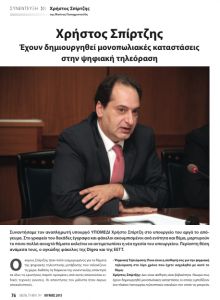«Έχουν δημιουργηθεί μονοπωλιακές καταστάσεις στην ψηφιακή τηλεόραση»τονίζει ο Αναπληρωτής Υπουργός Υποδομών, Μεταφορών και Δικτύων, κ. Χρήστος Σπίρτζη σε συνέντευξη που παραχώρησε στο περιοδικό «Ψηφιακή Τηλεόραση» και στη δημοσιογράφο Ματίνα Παπαχριστούδη
