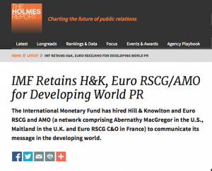 << Το Διεθνές Νομισματικό ΤΑΜΕΙΟ ΕΧΕΙ προσλάβει τις Εταιρείες Hill & Knowlton και Euro RSCG και ΑΜΟ, για να επικοινωνήσει το μήνυμά του στον αναπτυσσόμενο κόσμο. Hill & Knowlton θα διαχειρίζεται τις επικοινωνίες του ταμείου στη Μέση Ανατολή και την Ασία και η Euro RSCG για να χειριστεί την Αφρική και τη Λατινική Αμερική. Οι δύο συμβάσεις ανέρχονται μεταξύ 1,5 και 2 εκατομμυρίων δολλαρίων! Η Euro RSCG θα παρέχει υπηρεσίες δημοσίων σχέσεων και στήριξη στον Dominique Strauss-Kahn, ο οποίος ανέλαβε διευθύνων σύμβουλος του ΔΝΤ το Σεπτέμβριο … >>. Για τη συνεργασία αυτή διαβάστε επίσης το αποκαλυπτικό ρεπορτάζ του mediapart.fr εδω