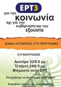 @Μαύρο ρίχνει η νέα διοίκησης της ΕΡΤ στην ελεύθερη αυτοδιαχειριζόμενη ΕΡΤ σε μια πρώτη κίνηση ενάντια στην φωνή της κοινωνίας στην τηλεόραση που εξυπηρετεί το δημόσιο συμφέρον. Με απόφαση της νέας Διοικούσας Επιτροπής της ΕΡΤ 3 κόβονται οι τρεις εκπομπές των αλληλέγγυων που σε δύσκολες στιγμές αγώνα των εργαζομένων της ΕΡΤ μετά το λουκέτο, στήριξαν με τους εργαζόμενους της στη Θεσσαλονίκη. Με πρόσχημα ότι από την Τετάρτη το πρόγραμμα της ΕΡΤ 3 θα μπει στο δίκτυο της ΕΡΤ πανελλαδικά και με τη διαβεβαίωση(!) πως θα δίνεται λόγος και βήμα στις νέες εκπομπές των εργαζομένων πλέον του καναλιού στα κοινωνικά κινήματα και την κοινωνία, η διοίκηση θέλει να σταματήσει τις τρεις εκπομπές που άφησαν το στίγμα τους στην ελεύθερη ΕΡΤ 3.Πρόκειται για εκπομπές στις οποίες δινόταν βήμα σε κοινωνικές ομάδες και συνδικάτα, αποκλεισμένα και φιμωμένα από όλα τα άλλα ΜΜΕ που παρουσίαζαν νέοι άνθρωποι. Την ίδια ώρα βέβαια μοιράζει εξωτερικές παραγωγές σε όσους λοιδωρούσαν τον αγώνα της ΕΡΤ και στήριζαν τη ΝΕΡΙΤ… @Ενάντια στην απόφαση να πέσει μαύρο εκδόθηκε ψήφισμα από 50 και πλέον συνδικάτα και θεσμικές οργανώσεις που ζητούν από την ΕΡΤ να συνεχιστούν οι εν λόγω εκπομπές. Οι παρουσιαστές τους ποτέ δεν ζήτησαν να προσληφθούν. Αντιθέτως κατατέθηκαν προτάσεις για το πως μπορεί -θεσμικά και τυπικά-να συνεχιστούν στο πρόγραμμα της ΕΡΤ 3. Η Δ.Ε ωστόσο έκλεισε τα αυτιά της και λέει πως θα συνεχιστεί μόνο η μία, επειδή σε αυτήν μετείχε και εργαζόμενος της ΕΡΤ 3. Έτσι κόβει την εκπομπή για την παιδεία και την εκπομπή για τα διεθνή θέματα που έδωσαν ορισμένα από τα καλύτερα και άκρως επαγγελματικά δείγματα ελεύθερης τηλεόρασης. Λές και δεν θα μπορούσαν οι εκπομπές αυτές να συνεχιστούν ως “εξωτερικές παραγωγές”. Αλλά προφανώς δεν πρόκειται για “ημετέρους” της ΝΕΡΙΤ στους οποίους αμέσως η διοίκηση της ΕΡΤ υπέγραψε τη σύμβαση εξωτερικής ανάθεσης. Η απόφαση να πέσει μαύρο από τη νέα διοίκηση της ΕΡΤ στις εκπομπές της φωνής της κοινωνίας προκάλεσε, όπως ήταν αναμενόμενο, μεγάλες ανατιδράσεις. Για αύριο Δευτέρα 22 και για την Τετάρτη 24 Ιουνίου έχουν προγραμματιστεί συγκεντρώσεις έξω από την ΕΡΤ 3. Ο αρμόδιος υπουργός Νίκος Παππάς άραγε τι λέει; Το σύστημα ΣΥΡΙΖΑ που έβγαινε συνέχεια στην ελεύθερη αυτοδιαχειριζόμενη ΕΡΤ 3 τι λέει; Θα συναινέσουν στο “μαύρο”, ακόμη δεν πρόλαβε να βγει η νέα ΕΡΤ στον αέρα;