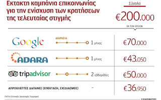 Το οικονομικό διακύβευμα για τον μήνα Αύγουστο σε επίπεδο άμεσων ταξιδιωτικών εισπράξεων από τις δαπάνες των ξένων τουριστών στη χώρα ξεπερνά τα 3,2 δισ. ευρώ. Σύμφωνα με πληροφορίες, η καμπάνια μέσω της Google θα αφορά χρήστες που κάνουν αναζήτηση με συγκεκριμένες λέξεις- κλειδιά. Στο πλαίσιο αυτό επιλέχθηκε η εμφάνιση μπάνερ στην κορυφή της οθόνης που θα οδηγεί στον υπό δημιουργία ιστότοπο greeksummer2015.com. Η καμπάνια θα τρέξει για ένα μήνα με αγορές - στόχους την Αυστρία, τη Γερμανία, την Ολλανδία, τη Γαλλία την Ελβετία και τη Βρετανία. Το κόστος της καμπάνιας μέσω της Google θα φθάσει σε 70.000 ευρώ.