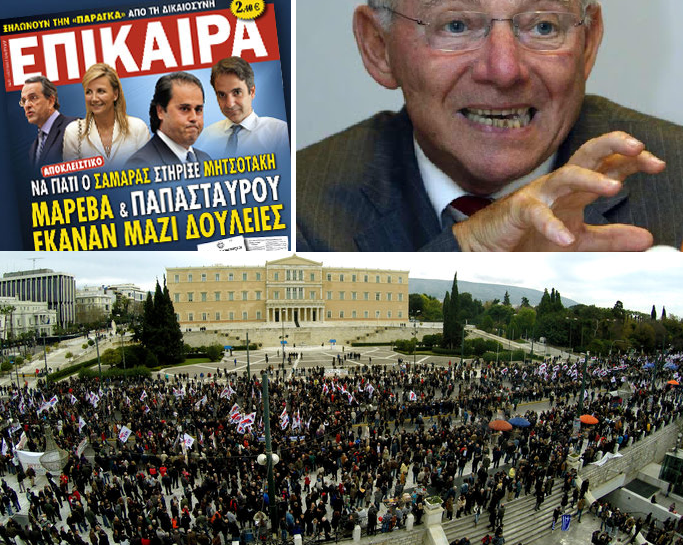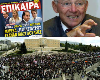 Ακολουθεί αντιδημοφιλές στάτους (3 σε 1) Οι "εντυπώσεις" της ημέρας που εμφανίζονται ως "ειδήσεις" - Το ότι η γυναίκα του Μητσοτάκη έκανε κάποια δουλειά με τον Παπασταύρου δεν λέει τίποτα από μόνο του. Για να έχει νόημα πρέπει να έχει κάνει παράνομη δουλειά μαζί του. Αυτό βέβαια δεν αθωώνει τον Παπασταύρου για άλλες του δραστηριότητες - Ο Σόιμπλε είναι από τους αθλιότερους εκβιαστές. Είναι επίσης κυνικός και έχει μια οικονομίστικη οπτική των πραγμάτων. Αλλά όταν λέει ότι "η έξοδος από το ευρώ - πριν από 5 χρόνια- θα δημιουργούσε λιγότερο πόνο στους Έλληνες" έχει δίκιο. Και έχει δίκιο γιατί ξέρει οικονομικά. Βρισκόμαστε σε μια χώρα που πλησιάζει το 30% η απώλεια στο ΑΕΠ.Το νόμισμα δεν είναι ιδεολογία, όπως βλακωδώς σκέφτονται ορισμένοι που αυτοπροσδιορίζονται ως "ευρωπαϊστές". Το νόμισμα είναι εργαλείο. Και αν αυτό το εργαλείο.. είναι λάθος, χρησιμοποείς άλλο. Μια χώρα σαν την Ελλάδα για να ανακτήσει κάποια ανταγωνιστικότητα μπορεί να το κάνει μόνο μέσω της υποτίμησης του νομίσματος. Και όντως μέσα στο ευρώ δεν μπορεί να το κάνει. Προφανώς μία έξοδος αυτή τη στιγμή θα οδηγήσει σε περαιτέρω απώλειες και μείωση του ΑΕΠ, αλλά αυτό επίσης δεν αθωώνει το ευρώ. Αυτό που συμβαίνει αυτή τη στιγμή είναι ότι θυσιάζεται ο μισός πληθυσμός, μπας και τη βγάλει καθαρή ο άλλος μισός. - Οι συγκεντρώσεις ήταν σήμερα πολύ μεγάλες, αλλά και με πολύ ετερόκλητο πλήθος. Απ' αυτούς που είναι εναντίον κάθε μνημονίου μέχρι αυτούς που είναι κατά αυτού του μνημονίου. Αυτούς που ονειρεύονται μια άλλη κοινωνία για όλους και αυτούς που τους ενδιαφέρει μόνο ο κώλος τους. Και είχαν κυρίως ένα μεγάλο πρόβλημα, που υπάρχει εδώ και χρόνια. Το ποσοστό των κάτω των 25 είναι εξαιρετικά μικρό. Αν οι νέοι δεν πάρουν την κατάσταση στα χέρια τους, αν δεν το πολεμήσουν χωρίς να υποχωρήσουν μέλλον μην περιμένετε. Κανείς που κατέχει την εξουσία δεν τρόμαξε από την φωτοβολίδα μιας 24ωρης απεργίας, όπου συμμετέχουν κυρίως μεσήλικες.