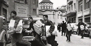 χαρτιού από τους τυπογραφικούς ρόλους που άφηναν τα φορτηγά έξω από το πιεστήριο της