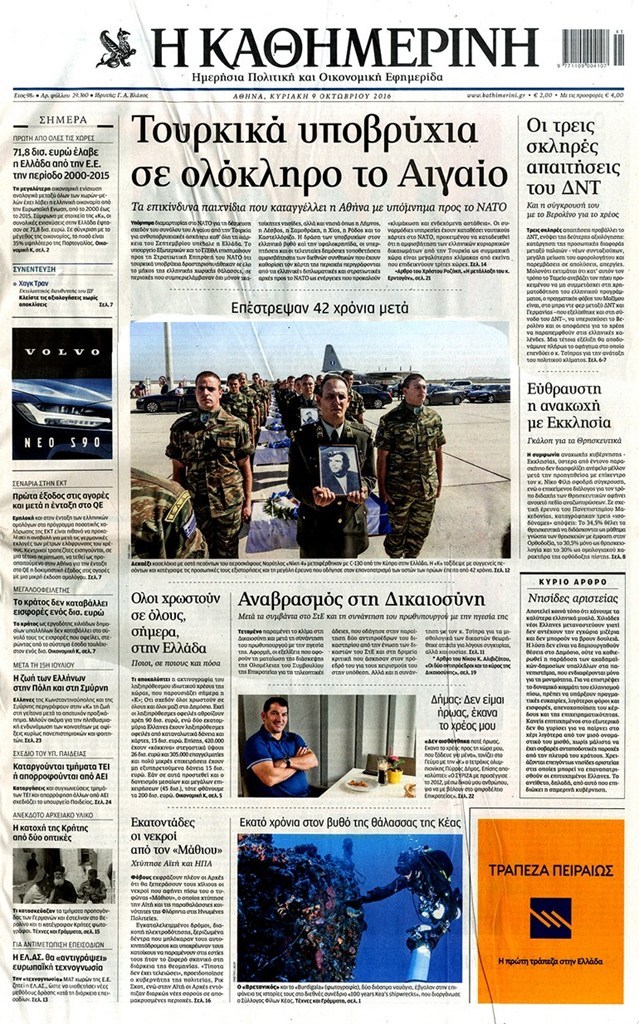 Τα πρωτοσέλιδα της Κυριακής 9/10 Ημερομηνία: