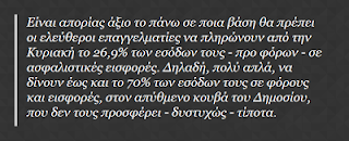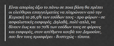 Αυτό, λοιπόν, είναι ένα από τα μεγαλύτερα προβλήματα των εταιρειών, που δραστηριοποιούνται στη χώρα μας: Το υπερβολικό – και χωρίς καμία λογική – ύψος των ασφαλιστικών εισφορών και φόρων, που καλούνται να πληρώσουν στο ελληνικό Δημόσιο. Πρόκειται για υποχρεώσεις, που επιβαρύνουν – εκτός από τους εργοδότες – και τους εργαζόμενους, με σκοπό να έχουν τι ακριβώς; Σύνταξη, όταν αποχωρήσουν από την εργασία τους, και ιατροφαρμακευτική περίθαλψη καθ΄ όλη τη διάρκεια του βίου τους.Παροχές, δηλαδή, πολύ χαμηλής ποιότητας, οι οποίες σε καμία περίπτωση δεν ανταποκρίνονται στα χρήματα, τα οποία καταβάλλονται. Εισφορές, που ζητούνται από τους ασφαλισμένους για να συντηρούν ένα γηρασμένο και απαρχαιωμένο κρατικό μηχανισμό, ο οποίος δεν προσφέρει ουσιαστικές υπηρεσίες προς αυτούς. Ασφαλώς και το σύστημα λειτουργεί έτσι, ώστε με τις εισφορές των εργαζομένων να χρηματοδοτούνται οι ελάχιστες δυνατές παροχές προς τους μη έχοντες. Και αυτό είναι σωστό. Η ύπαρξη, δηλαδή, ενός διχτυού κοινωνικής προστασίας. Μόνο, που πλέον, οι υπηρεσίες, οι οποίες προσφέρονται προς όλους τους ασφαλισμένους, είναι δυστυχώς οι ελάχιστες δυνατές. Και, είναι απορίας άξιο το πάνω σε ποια βάση θα πρέπει οι ελεύθεροι επαγγελματίες να πληρώνουν από την Κυριακή το 26,9% των εσόδων τους – προ φόρων – σε ασφαλιστικές εισφορές.Δηλαδή, πολύ απλά, να δίνουν έως και το 70% των εσόδων τους σε φόρους και εισφορές, στον απύθμενο κουβά του Δημοσίου, που δεν τους προσφέρει – δυστυχώς – τίποτα. Αντίθετα, το συγκεκριμένο μέτρο θα οδηγήσει – με μαθηματική ακρίβεια – σε παύση δραστηριοτήτων και αδυναμία (βλ. στάση) πληρωμών από την πλειονότητα των υπόχρεων. Δηλαδή, διεύρυνση της μαύρης τρύπας των ελλειμμάτων και νέα μέτρα. Η λύση είναι – θα το ξαναπώ – μείωση φορολογικών συντελεστών και εισφορών. Μόνο έτσι θα έρθουν επενδύσεις, δηλαδή ανάπτυξη και δουλειές. Καλημέρα σας και καλή χρονιά.