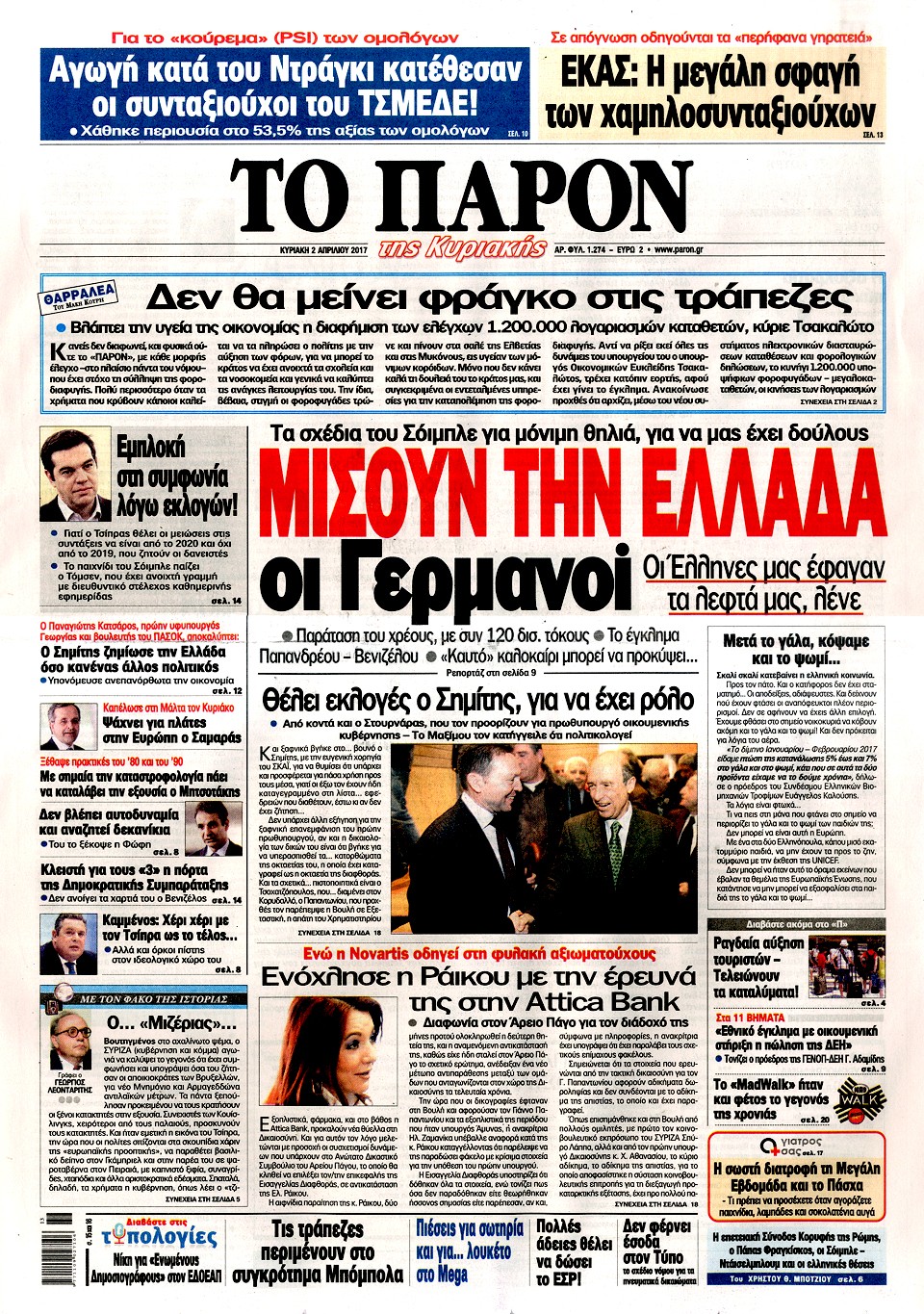 Τα πρωτοσέλιδα των Κυριακάτικων εφημερίδων 2 Απριλίου 2017