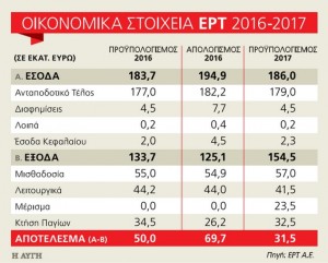 Σταθερός αιμοδότης του Δημοσίου η ΕΡΤ Της Αγγέλας Νταρζάνου στην “Αυγή” Από την επαναλειτουργία της μέχρι σήμερα, σύμφωνα με τα στοιχεία που κατέθεσε η διοίκηση των Δ. Τσακνή και Λ. Ταγματάρχη στη Βουλή, η ΕΡΤ έχει προχωρήσει στην υλοποίηση 79 εξωτερικών παραγωγών, με μέσο κόστος επεισοδίου τα 6.000 ευρώ. Επίσης στην υλοποίηση 5 μεικτών παραγωγών -εκ των οποίων οι 4 για καθημερινό πρόγραμμα- με συνολικό κόστος 510.000 ευρώ. Σταθερά πλεονάσματα εμφανίζει η ΕΡΤ τα τελευταία έξι χρόνια και ενισχύει το Δημόσιο ταμείο με 50 εκατ. ευρώ ετησίως, μνημονιακή υποχρέωση που συνεχίζεται μέχρι σήμερα. Για την ακρίβεια όλο το πλεόνασμα της ΕΡΤ, σχεδόν 70 εκατ. το 2016, κατευθύνεται στο Δημόσιο, τόσο για την εξυπηρέτηση του χρέους όσο και για κοινωνικές ανάγκες. Τα πλεονάσματα προέρχονται από το βασικό έσοδο της ΕΡΤ, το ανταποδοτικό τέλος, ύψους 182 εκατ. ευρώ το 2016. Προ κρίσης άγγιζε τα 300 εκατ. ευρώ και συχνά επιδοτούνταν και από τον κρατικό προϋπολογισμό, ενώ σήμερα τον ενισχύει. Από την επαναλειτουργία της μέχρι σήμερα, σύμφωνα με τα στοιχεία που κατέθεσε η διοίκηση των Δ. Τσακνή και Λ. Ταγματάρχη στη Βουλή, η ΕΡΤ έχει προχωρήσει στην υλοποίηση 79 εξωτερικών παραγωγών, με μέσο κόστος επεισοδίου τα 6.000 ευρώ. Επίσης στην υλοποίηση 5 μεικτών παραγωγών -εκ των οποίων οι 4 για καθημερινό πρόγραμμα- με συνολικό κόστος 510.000 ευρώ. Στον κινηματογράφο, για την ενίσχυση της παραγωγής μέσω του «1,5%», η ΕΡΤ κατέβαλε 4,8 εκατ. ευρώ τον περασμένο χρόνο, ενώ για ταινίες μικρού μήκους αναβίωσε το πρόγραμμα «Μικροφίλμ» ενισχύοντας με 300.000 ευρώ. Παράλληλα, ενίσχυσε συνολικά 21 Φεστιβάλ κινηματογράφου, με συνολικό ποσό 390.000 ευρώ. Για ελληνικές σειρές μυθοπλασίας, κωμικές και δραματικές, έχουν ήδη κατατεθεί περισσότερες από 50 προτάσεις, μετά από προκήρυξη. Στο προσεχές διάστημα η ειδική επιτροπή για την εξέταση των προτάσεων, με πρόεδρο τον Μιχάλη Γρηγορίου, θα παρουσιάσει στο Δ.Σ. τις προτάσεις και θα εισηγηθεί, προκειμένου να ξεκινήσουν οι παραγωγές μέσα στο καλοκαίρι. Οι επενδύσεις το 2016 (αγορά τεχνολογικού εξοπλισμού και μίσθωση προγράμματος) μόλις ξεπέρασαν τα 26 εκατ. ευρώ. Η αγορά εξοπλισμού δεν ξεπέρασε τα 2 εκατ. ευρώ, καθώς κόλλησε στο Ελεγκτικό Συνέδριο η αγορά ψηφιακών πομπών. Η μίσθωση προγράμματος, σύμφωνα με τη διοίκηση, ανήλθε σε 5,6 εκατ. ευρώ, ενώ το υπόλοιπο ποσό υπολογίζεται ότι κατευθύνεται στην αγορά δικαιωμάτων για μεταδόσεις Champions League, Europa League, Euroleague, Eurocup κ.ά. αθλητικές διοργανώσεις. Για την επόμενη τηλεοπτική περίοδο 2017-18 η ΕΡΤ θα διεκδικήσει επιπλέον το Mundial, αλλά και τους Ολυμπιακούς Αγώνες του 2020. Αν και το αθλητικό πρόγραμμα της ΕΡΤ είναι υπερπλήρες και μάλλον δυσανάλογα μεγάλης διάρκειας, το έσοδό της από διαφήμιση (7,7 εκατ. ευρώ) προέρχεται από αθλητικές μεταδόσεις. Το μισθολογικό κόστος, 55 εκατ. ετησίως, αποτελεί το 30,6% των εσόδων της ΕΡΤ και έχει μειωθεί σοβαρά, καθώς προ κρίσης είχε ξεπεράσει το 50% των εσόδων.
