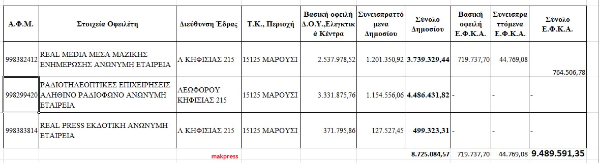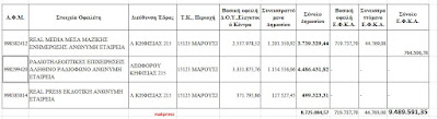 Αυτή είναι η κακή επιχειρηματικότητα που κατέστρεψε την Ελλάδα. Οι τρεις εταιρείες του Νίκου Χατζηνικολάου, οφείλουν τα εξής, σύμφωνα με την επίσημη Δημοσιοποίηση ληξιπρόθεσμων οφειλών νομικών προσώπων και οντοτήτων προς το Δημόσιο και τον Ε.Φ.Κ.Α. (http://www.aade.gr/dl_assets/dos/ofeilnp2017_1.html) Συνολικές οφειλές την 24/11/2017: 9.489.591,35 €