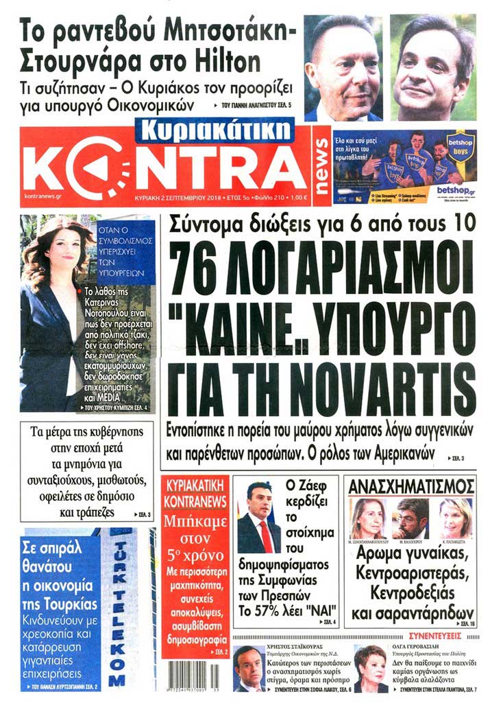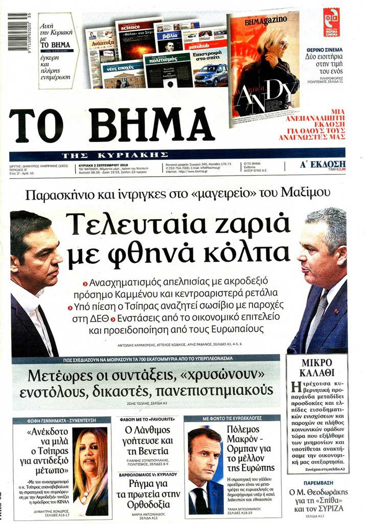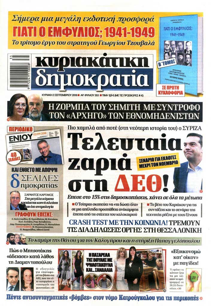 Τα πρωτοσέλιδα των Κυριακάτικων εφημερίδων 2ας Σεπτεμβρίου 2018 Ημερομηνία:
