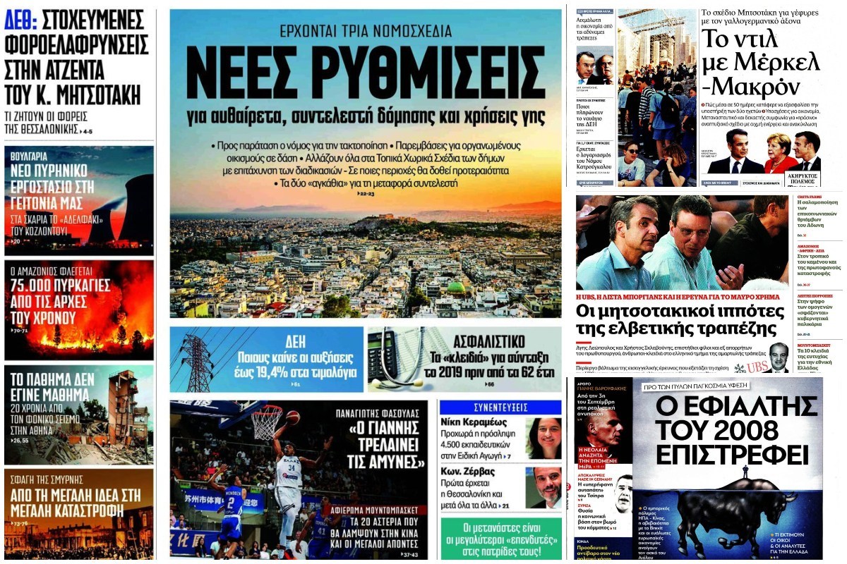 Δείτε τα κυριότερα πρωτοσέλιδα του κυριακάτικου Τύπου για σήμερα, 1 Σεπτεμβρίου 2019.