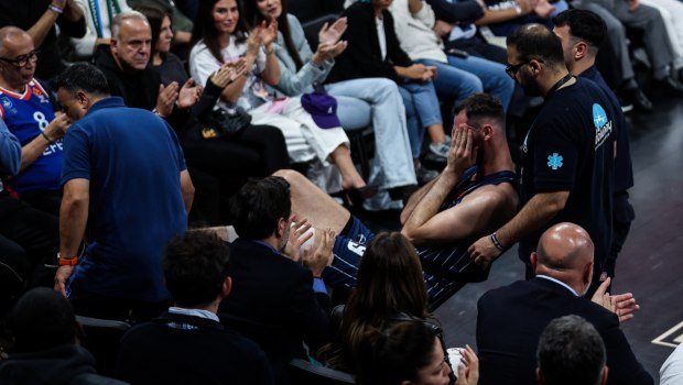 Ο Έλληνας ψηλός προσγειώθηκε με τον χειρότερο τρόπο στο παρκέ και αποχώρησε μετά από πέντε λεπτά με φορείο και έχοντας ξεσπάσει σε κλάματα.googletag.cmd.push(function() { googletag.display("300x250_middle_2"); });document.addEventLis...